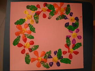 Μία απλή κατασκευή που γίνεται εύκολα από τα παιδιά-Παίρνουμε ένα χοντρό χαρτόνι και κόβουμε έναν κύκλο και μέσα σε αυτόν κόβουμε έναν ακόμη κύκλο(τρύπα).Τα παιδιά βάζουν ξύλινα μανταλάκια γύρω από τον κύκλο. Στη συνέχεια μπορούν να κολλήσουν ή να δέσουν αληθινά λουλούδια που θα έχουν κόψει. Εναλλακτικά ζωγταφίζουν και κόβουν λουλούδια από χαρτί και τα κολλούν στα μανταλάκια.