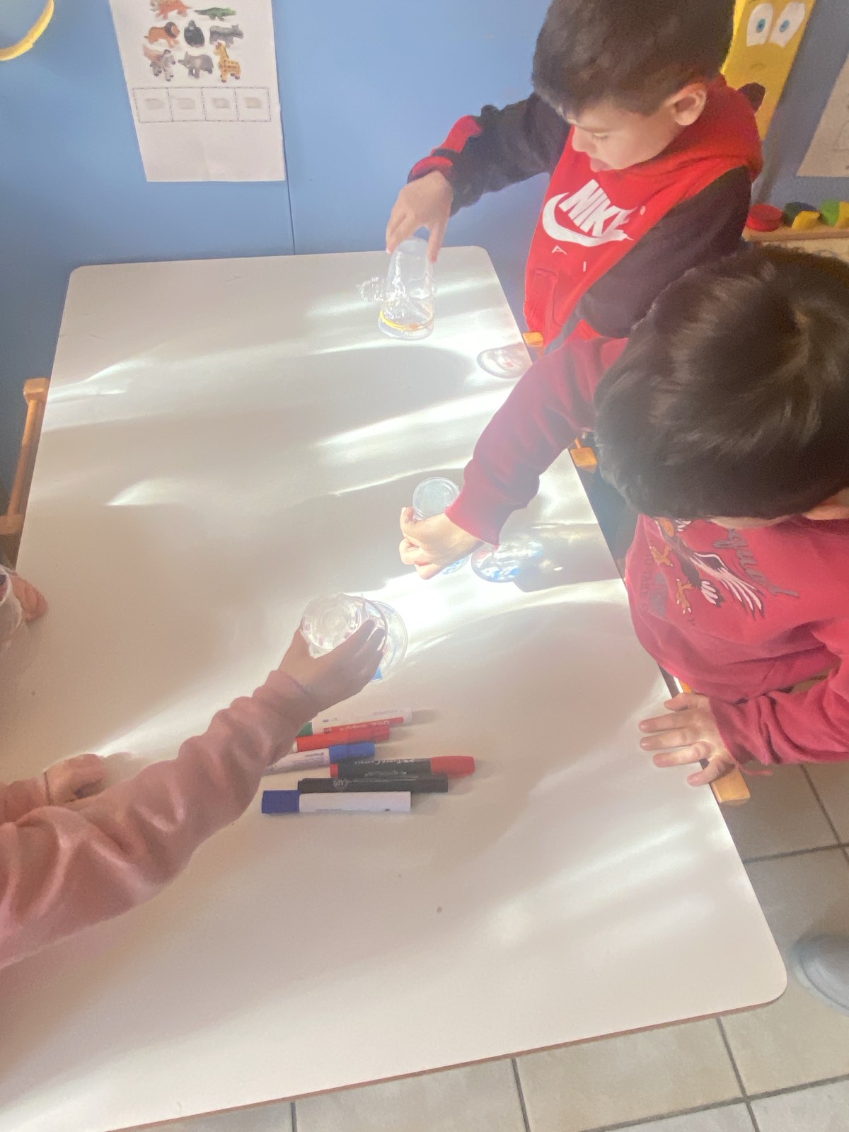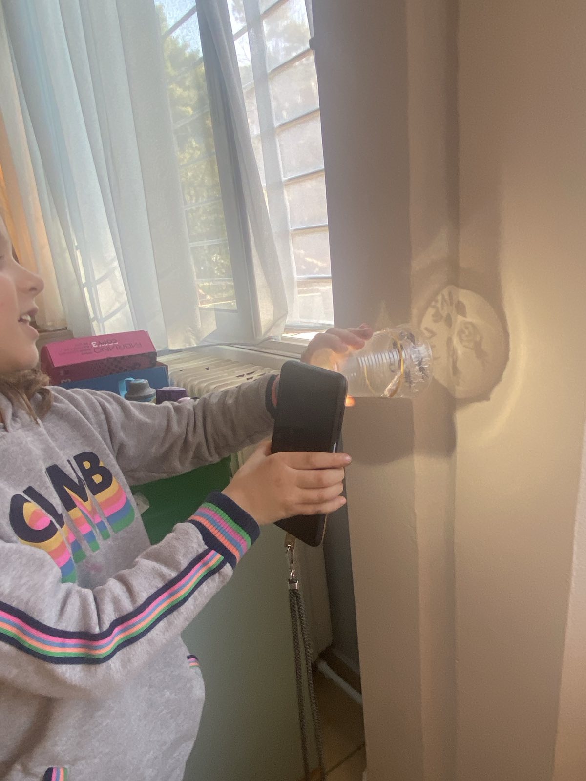 Αργότερα χρησιμοποιήσαμε απλά υλικά, (πλαστικό ποτήρι ζελατίνα μαρκαδόρους και λαστιχάκια) και προσπαθήσαμε να δημιουργήσουμε σκιές. Κλείσαμε το πάνω μέρος του ποτηριού με ζελατίνη τη στερεώσαμε καλά με το λαστιχάκι και το κάθε παιδί σχεδίασε ότι ήθελε επάνω στη ζελατίνη. Με τη βοήθεια του φακού είδαμε τα σχέδιά μας στον τοίχο.