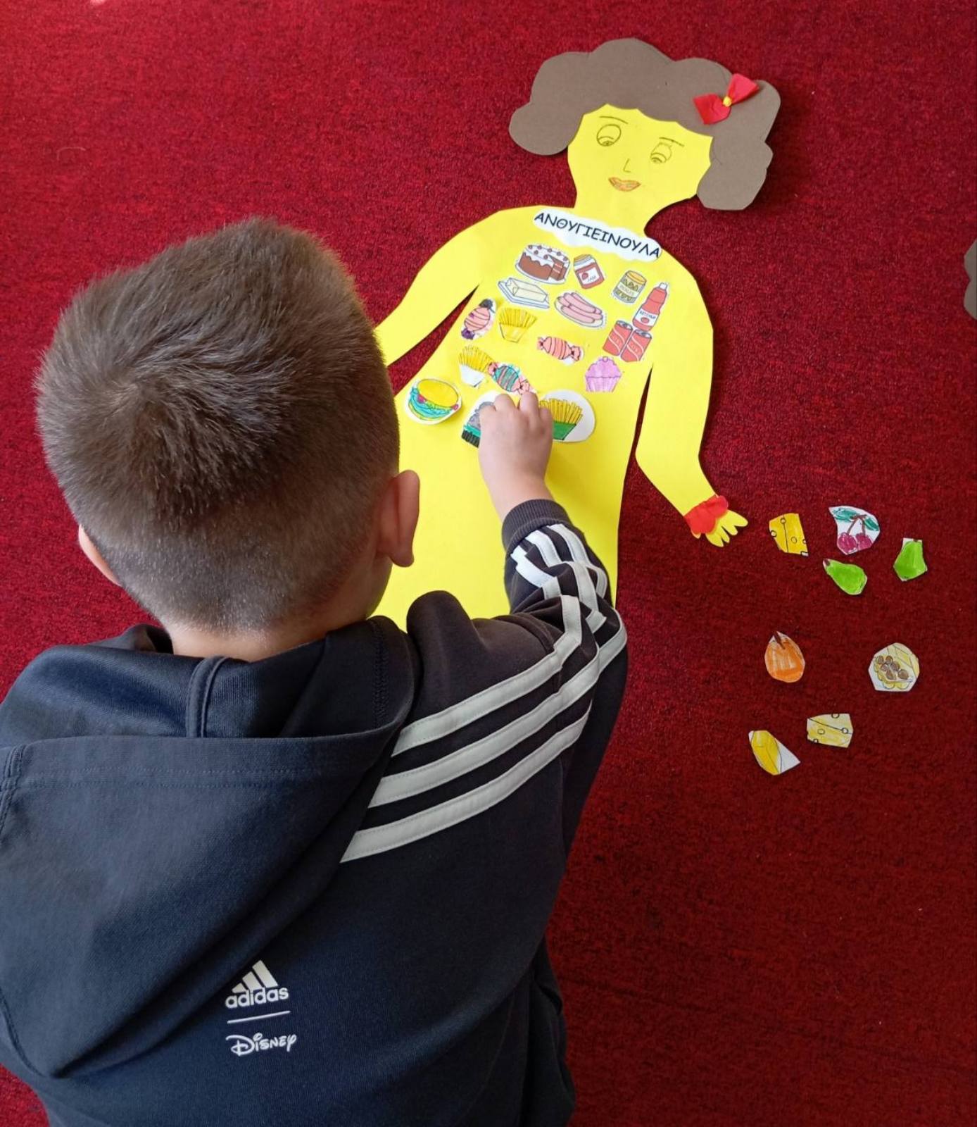 Ακολούθησαν δραστηριότητες που αφορούσαν την κατανόηση των υγιεινών και ανθυγιεινών τροφών. Τα παιδιά επεξεργάστηκαν εικόνες από διάφορα είδη τροφών, συζήτησαν για την αξία τους. Κατόπιν προχωρήσαμε στην κατασκευή δύο φιγούρων: της «Υγιεινούλας» και της «Ανθυγιεινούλας». Αφού τα παιδιά ζωγράφισαν εικόνες από τροφές, με κόλληση τις τοποθέτησαν στη σωστή φιγούρα, καλλιεργώντας δεξιότητες ταξινόμησης, αλλά και ικανότητα να αναγνωρίζουν τι είναι ωφέλιμο για το σώμα τους.