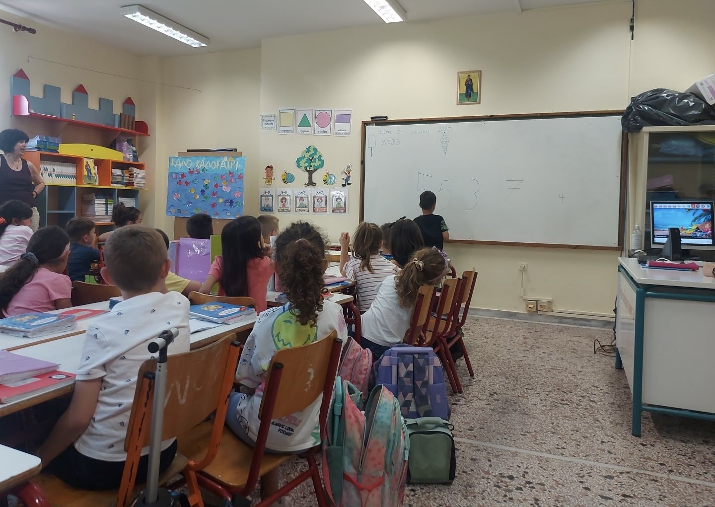 Στην συνέχεια και αφού μπήκαν όλοι στις τάξεις τους, η διευθύντρια του δημοτικού σχολείου μας οδήγησε στην αίθουσα της Α τάξης. Με πολύ χαρά βρήκαμε εκεί τους παλιούς μας φίλους αφού με όλα τα παιδάκια είμασταν πέρυσι συμμαθητές.