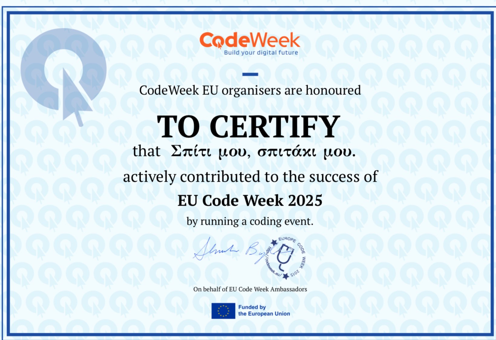 Για την συμμετοχή μας στην ευρωπαϊκή εβδομάδα κώδικα πήραμε πιστοποιητικό.