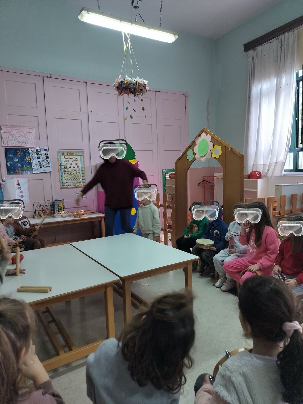 Φως και σκιά. Τα παιδιά πειραματίζονται και μαθαίνουν ότι όταν το φως συναντάει εμπόδιο δημιουργεί σκιά. Παίζουν με τη σκιά τους μπροστά στο φως του προτζέκτορα. Ζωγραφίζουν τη σκιά πλαστικών ζώων – παιχνιδιών.