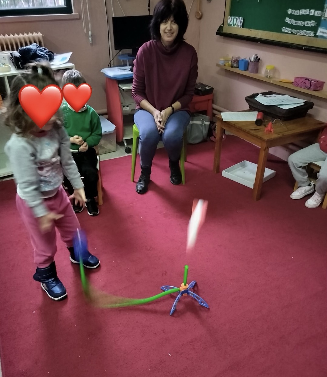 Δραματοποίηση: Αντίστροφη μέτρηση και «εκτόξευση» με έναν μεγάλο πύραυλο που κατασκευάσαμε . Χρησιμοποιούμε μουσικά όργανα για ηχητικά εφέ.