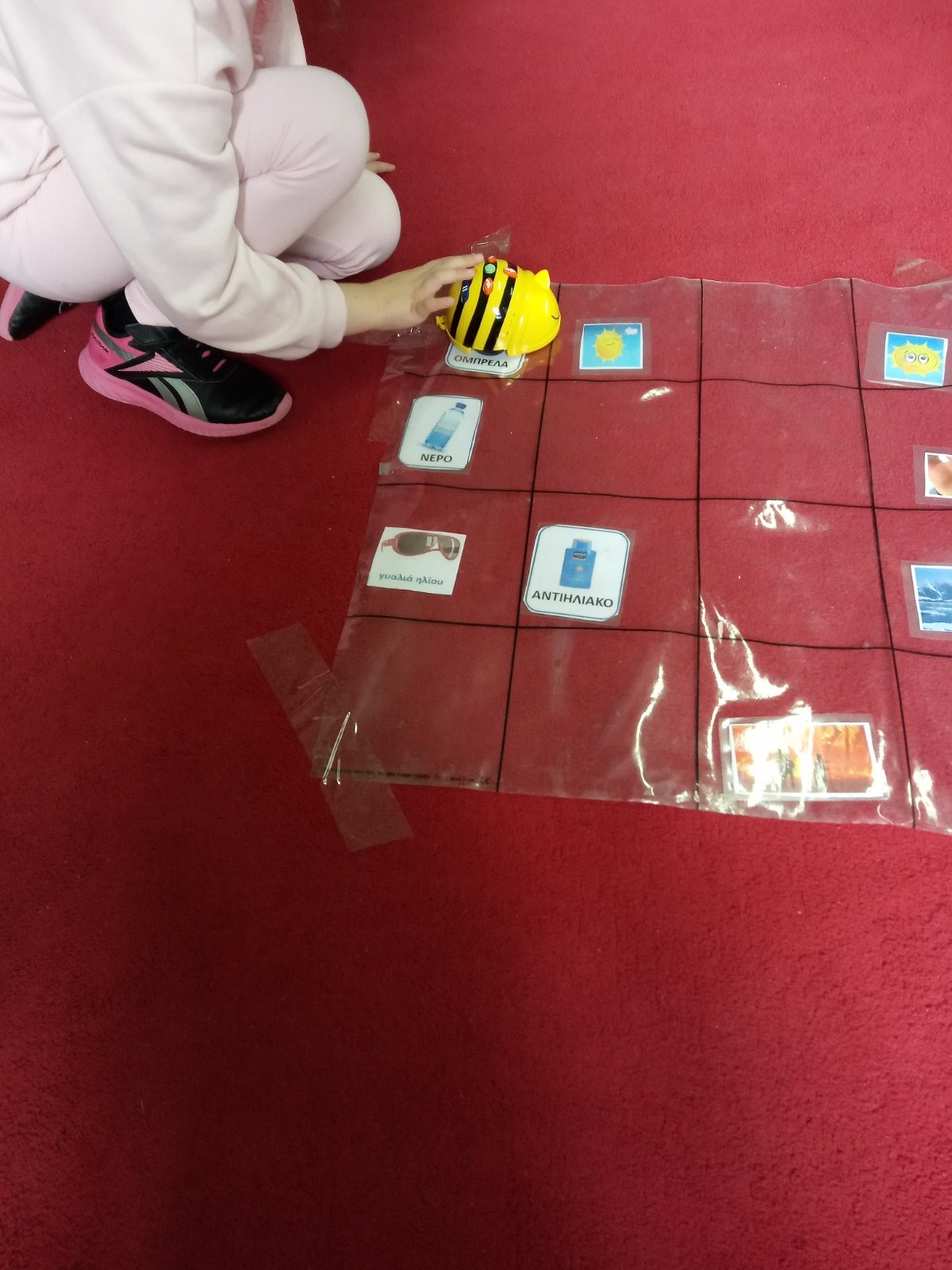 Συζητάμε για τον ήλιο και με την βοήθεια του Bee-Bot ξεχωρίζουμε τα αντικείμενα που κάνουν τον ήλιο « χαρούμενο» και αυτά που τον κάνουν «λυπημένο».