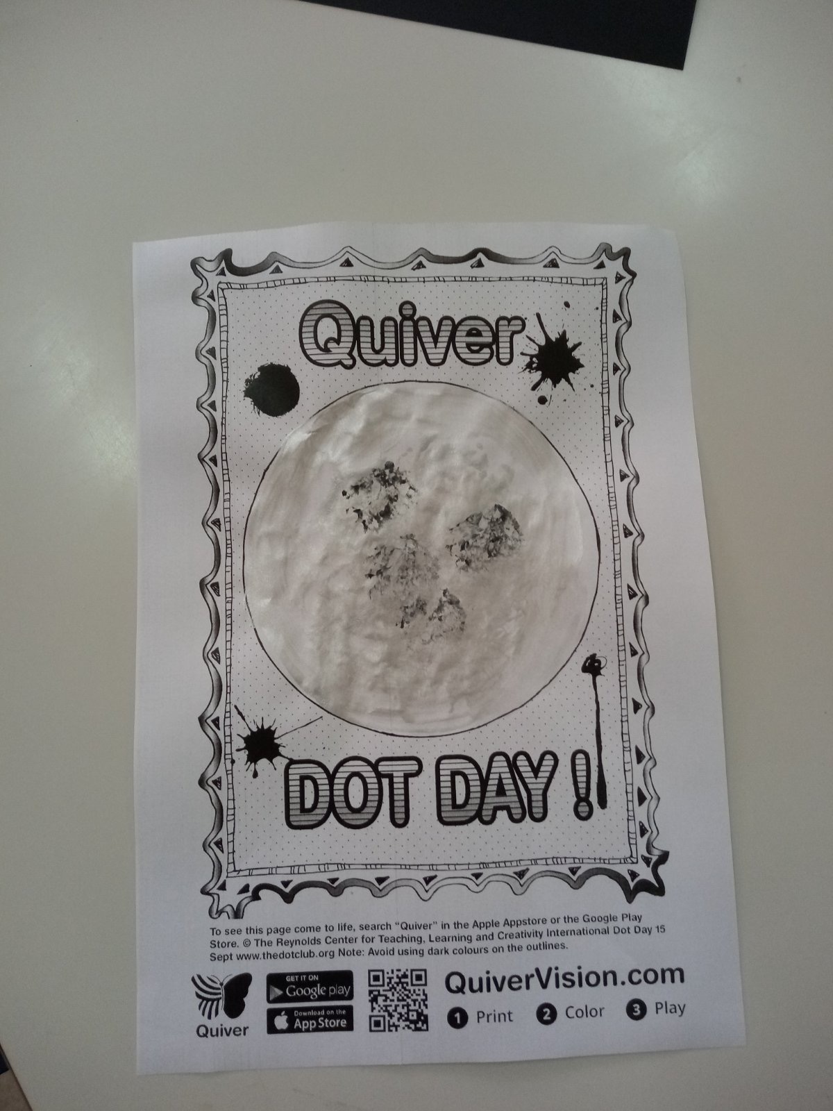 Μεταμορφώσαμε τις τελείες μας σε σελήνη .Βαψαμε με ασημί τέμπερα χρησιμοποιώντας αλουμινόχαρτο τυλιγμένο σε μπαλίτσα για να κάνουμε τυπώματα.Με την εφαρμογή επαυξημένης πραγματικότητας quiver είδαμε το φεγγάρι μας να αιωρείται πάνω από το φύλλο εργασίας.