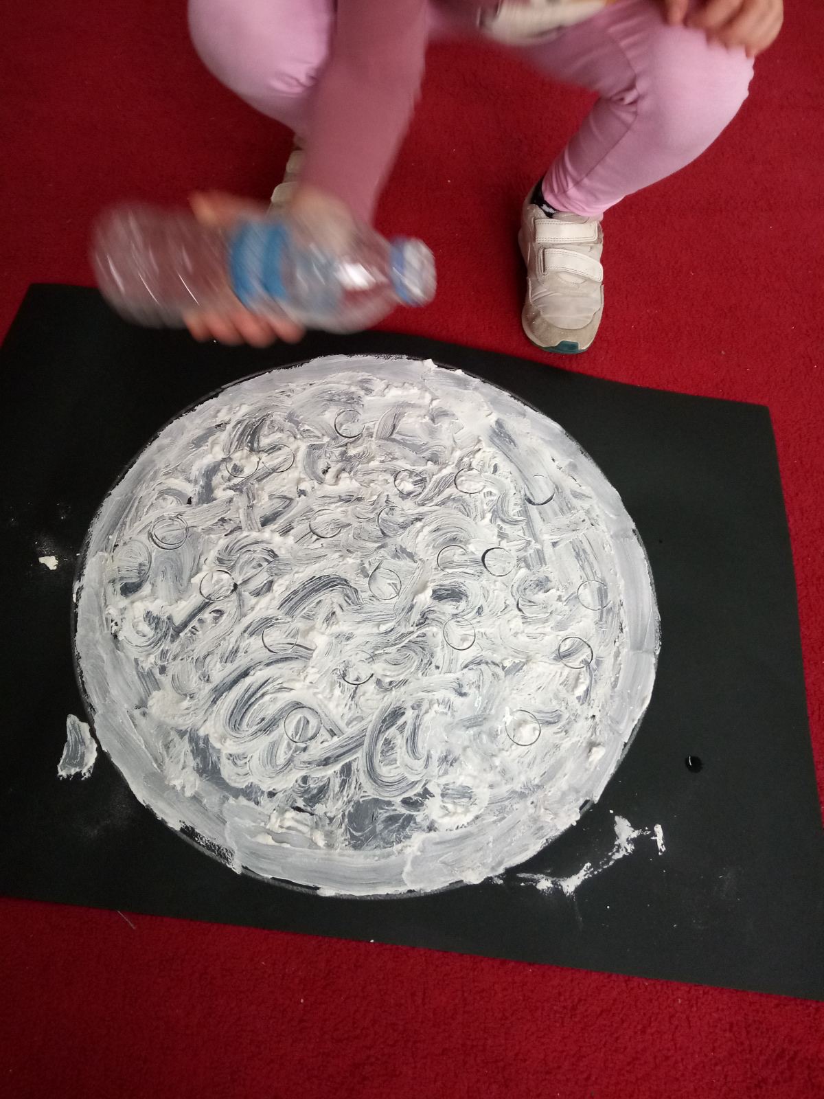 Βλέπουμε τους κρατήρες του φεγγαριού σε εικόνες και βίντεο στο διαδίκτυο .φτιαχνουμε στον κύκλο μια ομαδική εργασία. Ένα φεγγάρι με αλεύρι ανακατεμένο με άσπρη τέμπερα.με το στόμιο από ένα πλαστικό μπουκάλι δημιουργούμε κρατήρες.