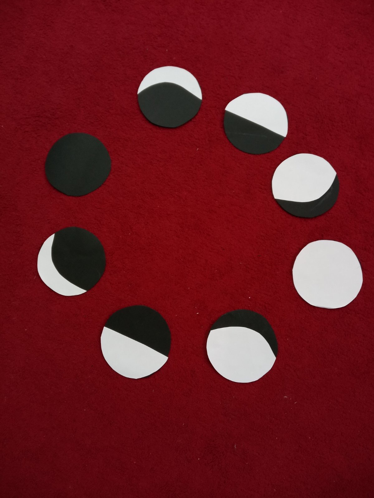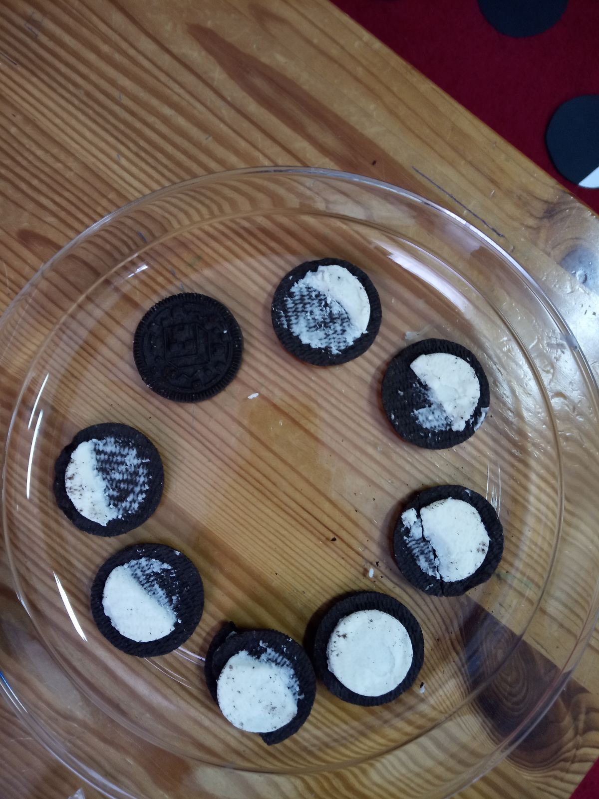 Τέλος μιλάμε για τις φάσεις σεληνης. Βλέπουμε σχετικό βίντεο, βάζουμε στην σειρά σε κύκλο τις φάσεις που έχω φτιάξει με μαύρο και άσπρο χαρτί. Φτιάχνουμε τις φάσεις του φεγγαριού με μπισκότα oreon.