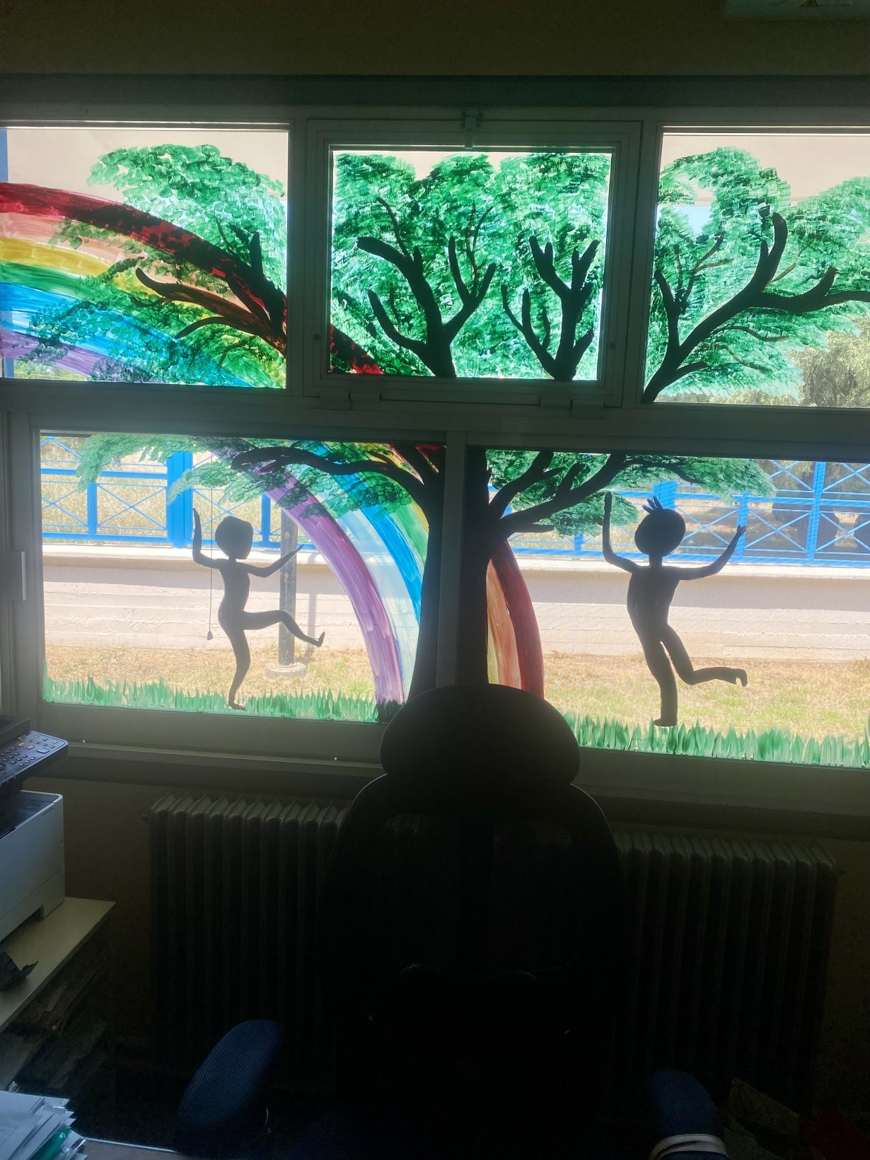 Το σχολείο μας γέμισε χρώματα και χαμόγελα! Μια ταλαντούχα κυρία επισκέφθηκε την τάξη μας και ζωγράφισε τα παράθυρα με υπέροχα σχέδια που ξεχειλίζουν από φαντασία και δημιουργικότητα. Τα παιδιά ενθουσιάστηκαν με τη διαδικασία και παρακολούθησαν με ενδιαφέρον πώς τα απλά τζάμια μεταμορφώθηκαν σε έργα τέχνης!
