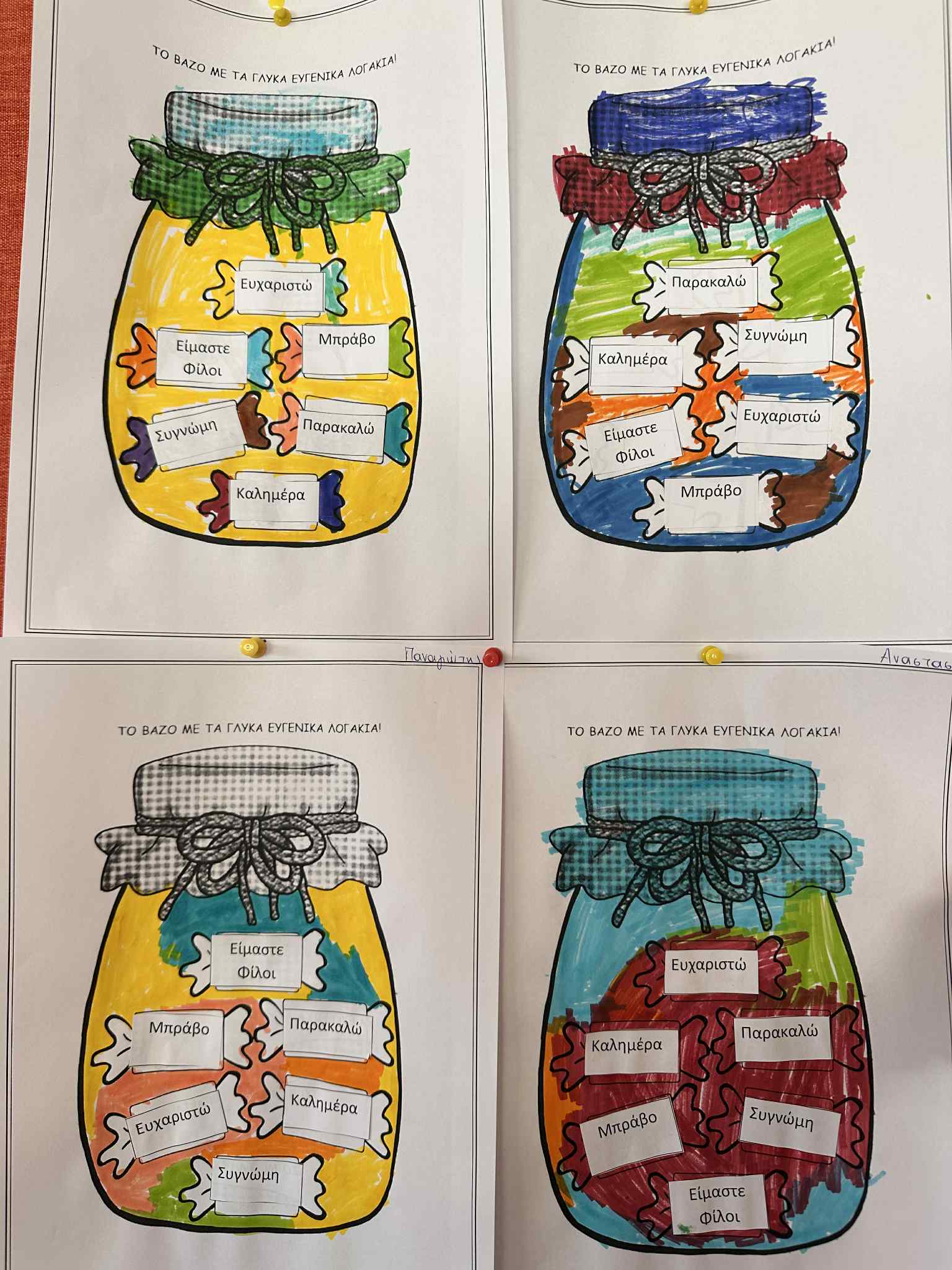 Παράλληλα, τα παιδιά χρωμάτισαν και το δικό τους «βάζο», το στόλισαν με πολύχρωμα σχέδια και το γέμισαν με τις ίδιες γλυκές και ευγενικές λέξεις και φράσεις! Τα βάζα μας δημιούργησαν μια όμορφη συλλογή από λόγια που κάνουν την καθημερινότητά μας πιο χαρούμενη και γεμάτη αγάπη, ενώ τα παιδιά ανακάλυψαν τη δύναμη των καλών λέξεων και έμαθαν ότι η ευγένεια είναι το πιο γλυκό «γλυκό» που μπορούμε να προσφέρουμε!!