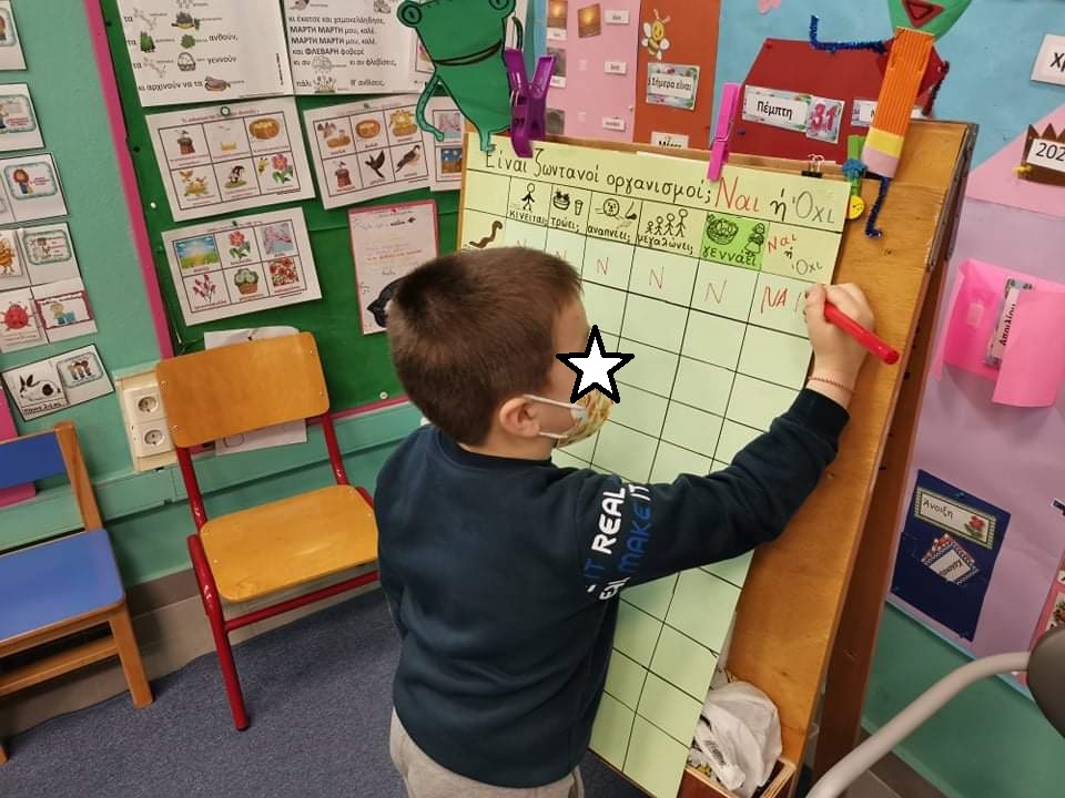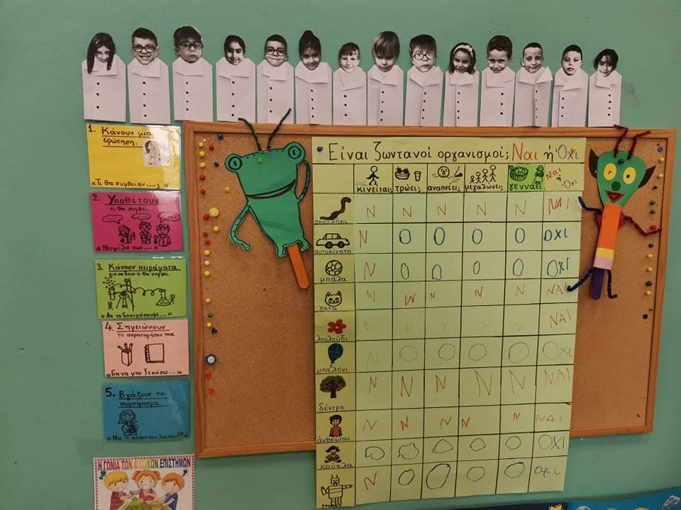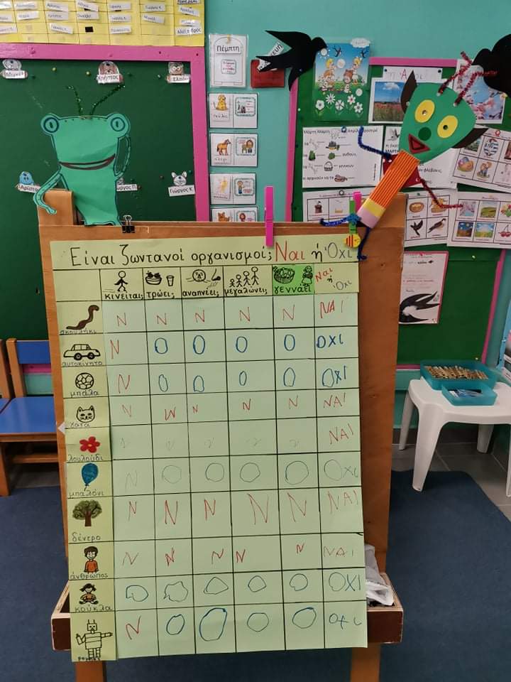 Εξερεύνηση μέσω κουκλοθεάτρου: Είχαμε μια απρόσμενη επίσκεψη από 2 εξωγήινους που ήρθαν να δουν τη γη. Κρατούσαν φωτογραφίες (κάρτες)με εικόνες π.χ. μπάλα, μέλισσα, δέντρο, άνθρωπος κ.τ.λ. και ζήτησαν από τα παιδιά να τους βοηθήσουν να ξεχωρίσουν τους ζωντανούς οργανισμούς (έμβια) από τους μη ζωντανούς οργανισμούς (άβια). Το παιχνίδι έγινε με τη βοήθεια του πίνακα που έχει τα κριτήρια για τα έμβια και τα άβια