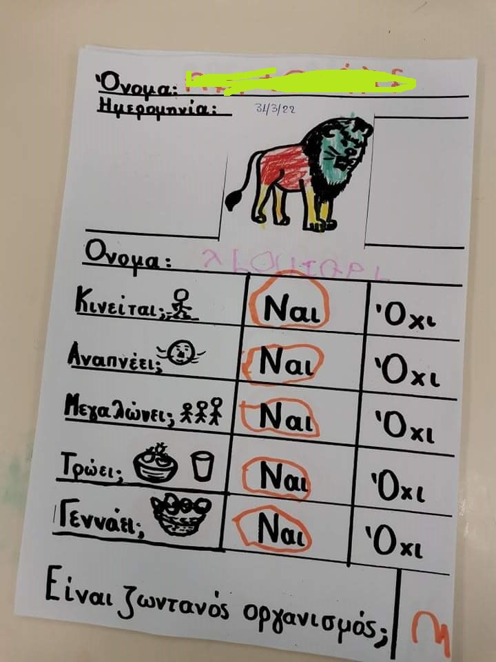 Σε ατομικό φύλλο εργασίας συμπέραναν ότι το λιοντάρι είναι ζωντανός οργανισμός