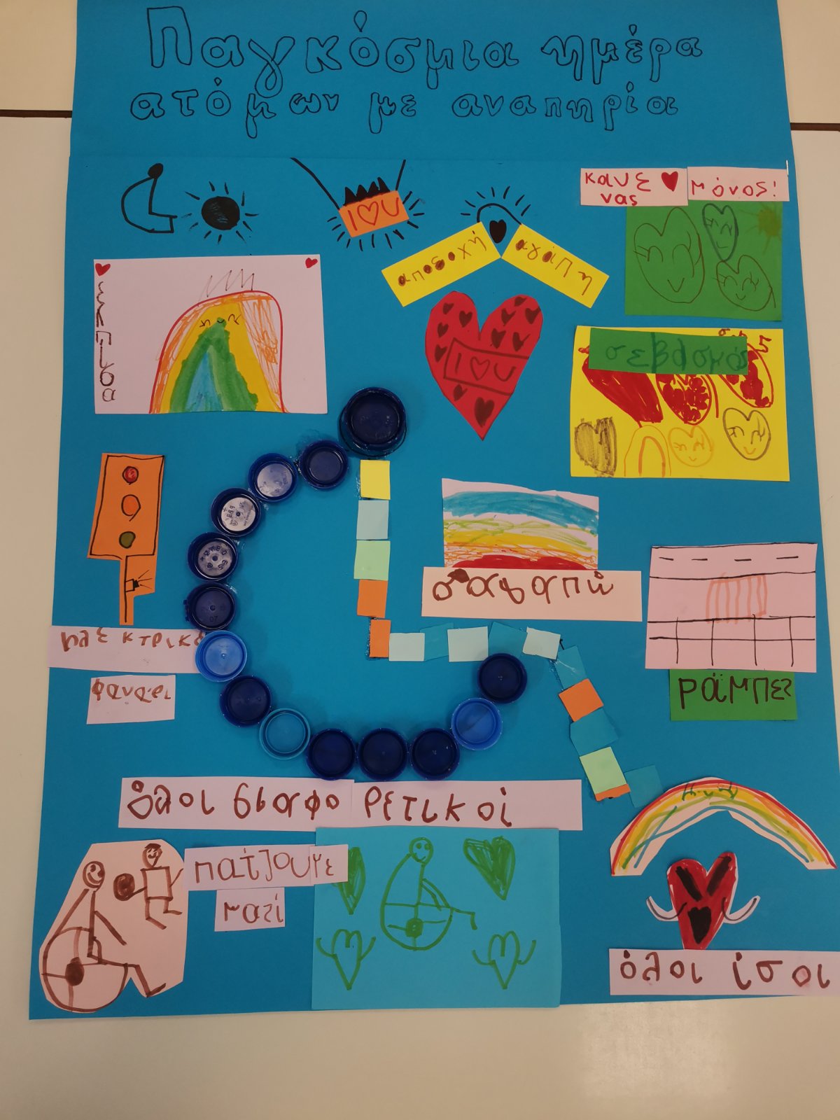 Η 3η Δεκεμβρίου έφτασε και μαζί με τα παιδιά μιλήσαμε για την “Παγκόσμια Ημέρα Ατόμων με Αναπηρία”. Αφόρμηση ήταν το τραγούδι: “Στην παγκόσμια γειτονιά όλοι διαφορετικοί”, που ακούσαμε στον υπολογιστή. Τα παιδιά είπαν τις δικές τους εμπειρίες κι έπειτα με τη βοήθεια έντυπου υλικού, συζητήσαμε για τα άτομα με διαφόρων ειδών αναπηρίες με σκοπό την ευαισθητοποίηση των παιδιών στο θέμα αυτό. Ακολούθησαν βιωματικές δραστηριότητες προκειμένου να αντιληφθούν τις δυσκολίες που αντιμετωπίζουν τα άτομα αυτά στην καθημερινότητα, ώστε να καλλιεργηθεί η ενσυναίσθηση και η αξία της αλληλεγγύης. Τα παιδιά αντιλήφθηκαν ότι τα άτομα με αναπηρία μπορούν να κάνουν όλα όσα κάνουν όλοι οι άνθρωποι και χρειάζονται αποδοχή. Όλοι ίσοι και διαφορετικοί.