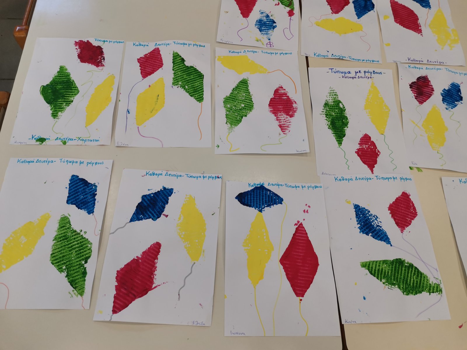 Στη συνέχεια συνδυάσαμε τον χαρταετό με το σχήμα του ρόμβου και δημιουργήσαμε με την τεχνική του τυπώματος ρόμβους με τέμπερες, σε ατομικό φύλλο εργασίας αλλά και ομαδικά!