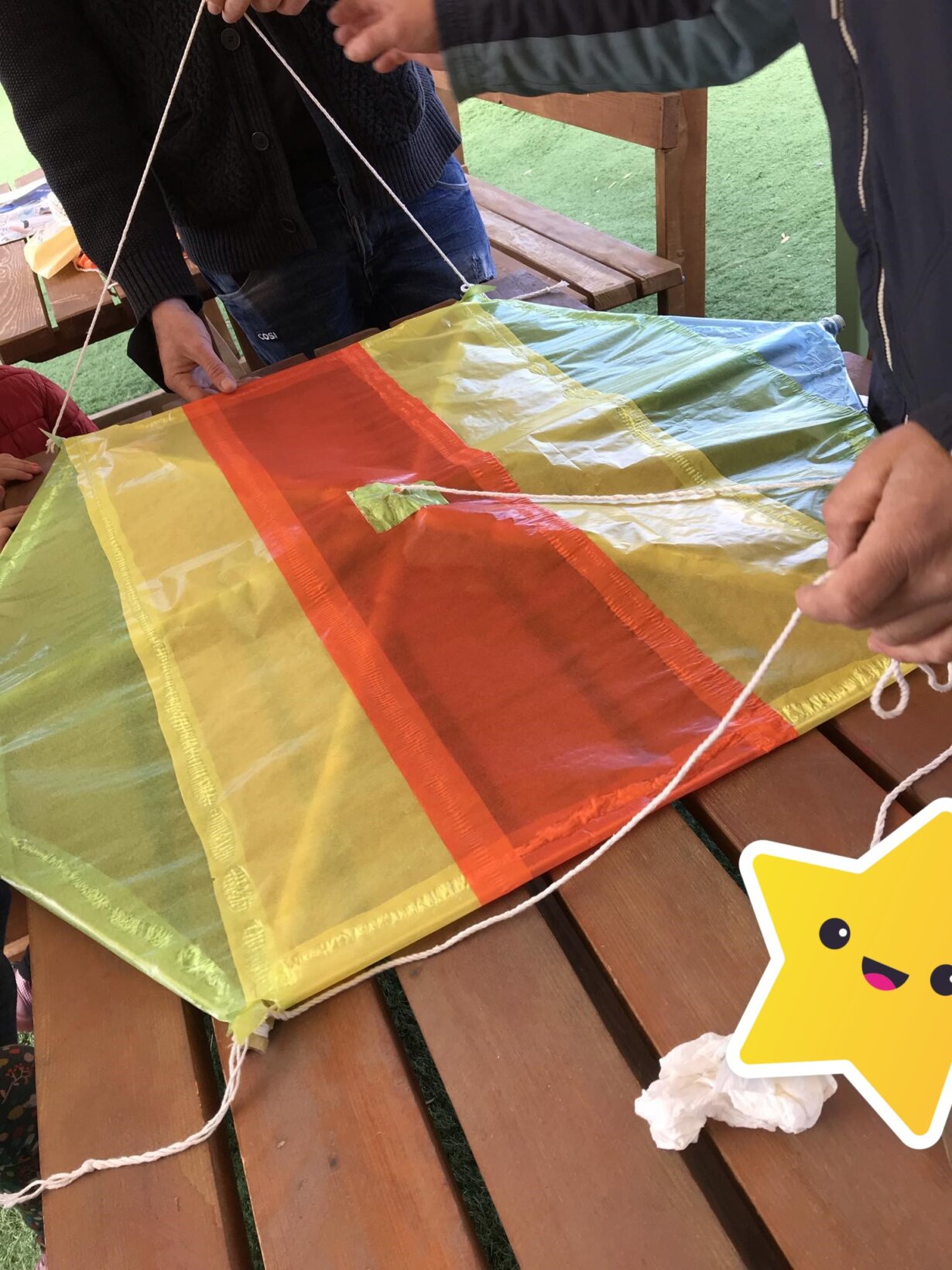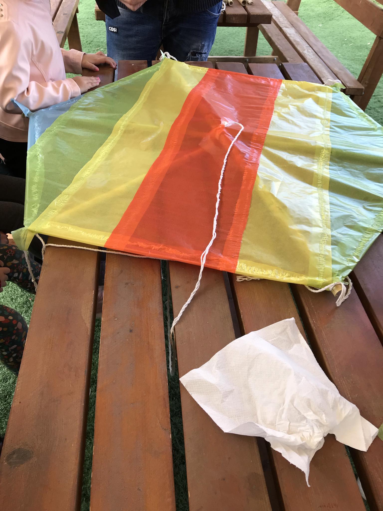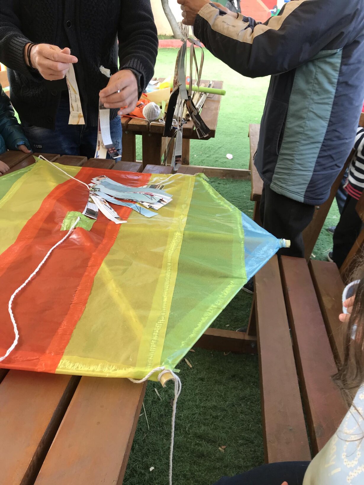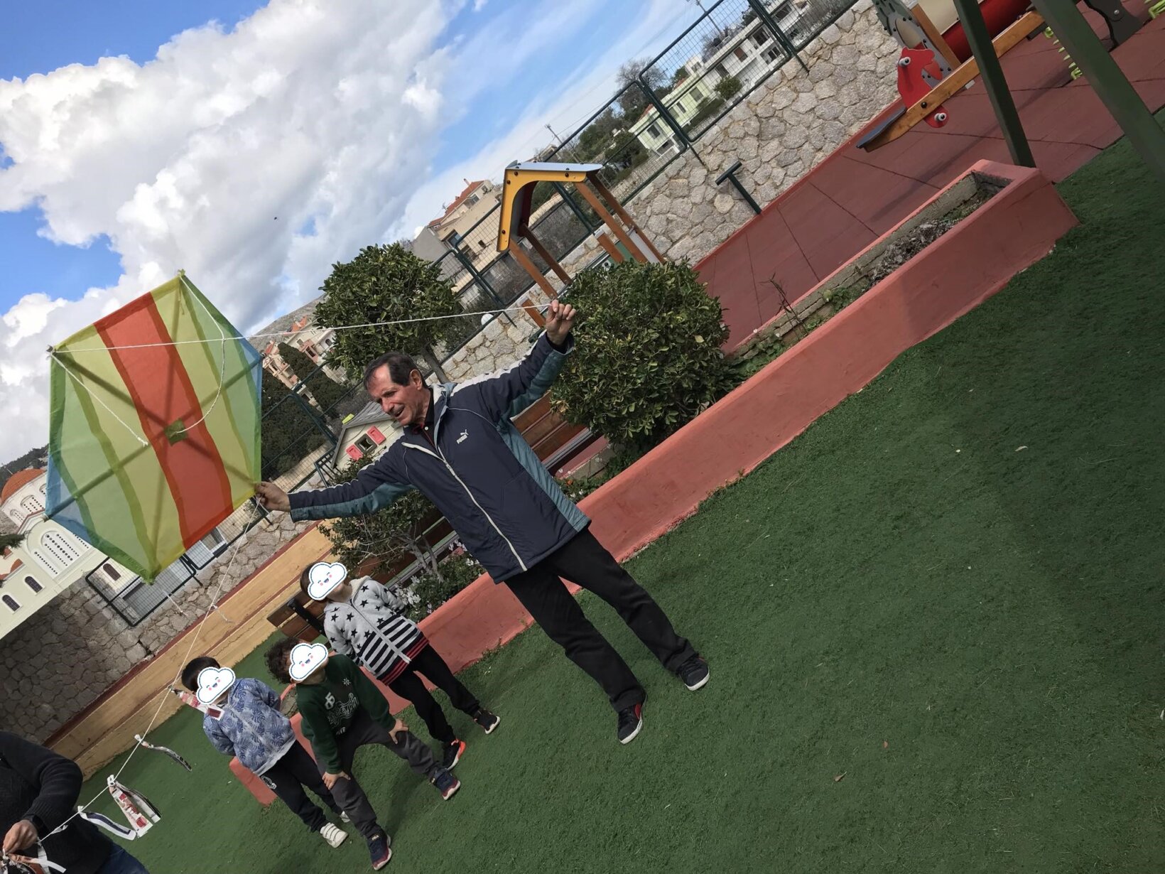 Με την καθοδήγησή του υπολογίσαμε, μετρήσαμε, κόψαμε και κολλήσαμε τα χρωματιστά χαρτιά του και όλα αυτά που χρειάζονταν ο χαρταετός μας για να είναι έτοιμος για την πρώτη δοκιμαστική του πτήση στην αυλή του σχολείου μας!