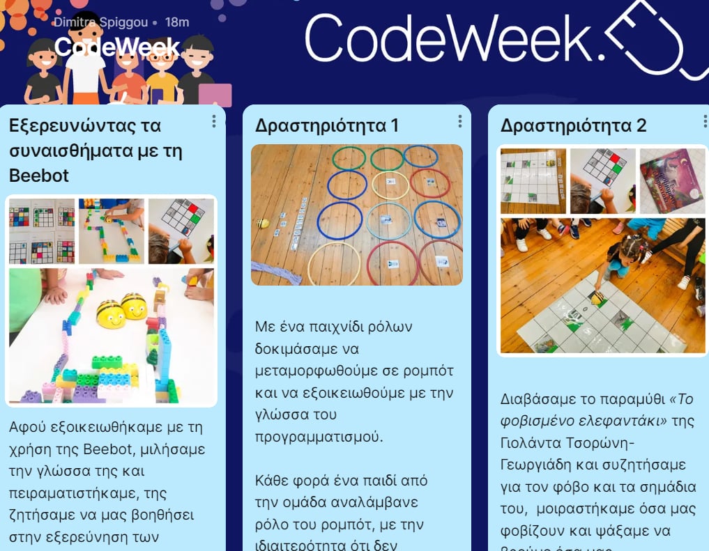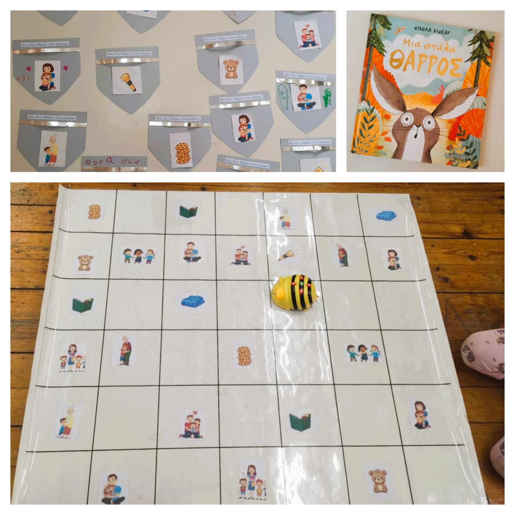 Στο σχολείο μας, αφού εξοικειωθήκαμε με τη χρήση της Beebot, μιλήσαμε την γλώσσα της και πειραματιστήκαμε, της ζητήσαμε να μας βοηθήσει στην εξερεύνηση των συναισθημάτων μας. Στα πλαίσια του CodeWeek προσεγγίσαμε με τους μαθητές και τις μαθήτριες το αίσθημα του φόβου αλλά και του θάρρους με δραστηριότητες χωρίς σύνδεση στο διαδίκτυο.