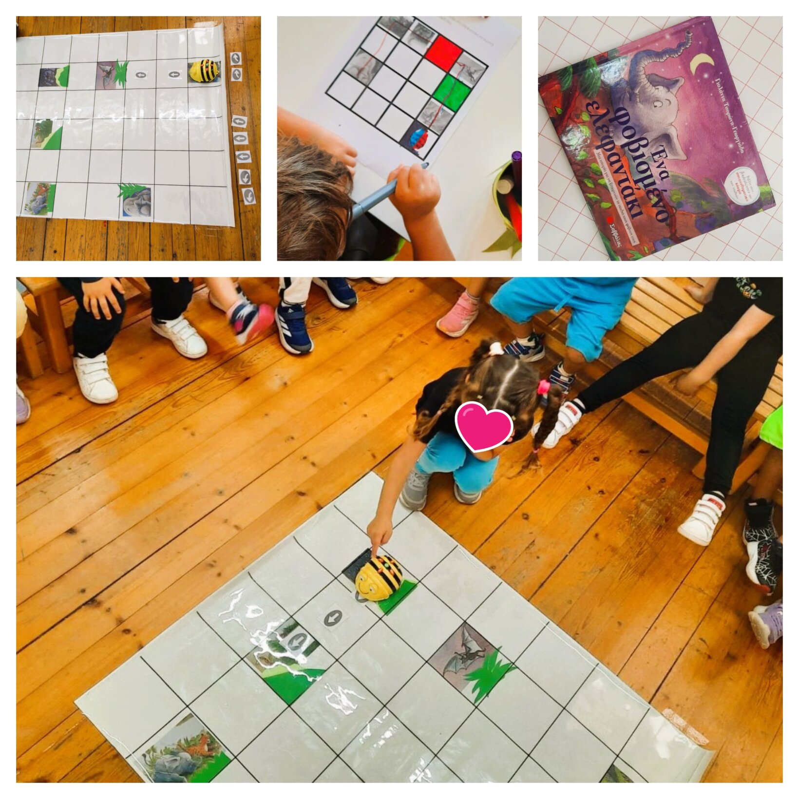 H ΒeeBot μας βοηθάει να ξεχωρίσουμε το κουβαδάκι με το όνομά μας πάνω στον οποίο είναι γραμμένο το όνομά μας και το ξεχωριστό ζωάκι μας. Τα παιδιά έχουν παίξει παιχνίδια με τις κατευθύνσεις μπροστά, πίσω, αριστερά και δεξιά και έχουν πειραματιστεί δείχνοντας το ζάρι με τους αριθμούς να περπατήσουν πάνω σε τετράγωνα με την ανάλογη διαδρομή που τους ορίζει το ζάρι. Τα μεγάλα παιδιά βοηθούν τα μικρότερα. Στη συνέχει μαθαίνουν να προγραμματίζουν τη BeeBot για να κινηθεί πάνω στο ανάλογο χαλάκι. Πάνω στο χαλάκι τοποθετούμε τα κουβαδάκια με τους μαρκαδόρους που γράφουν πάνω το όνομά τους με το ανάλογο ζωάκι τους. Τα παιδιά κρατώντας στο χέρι τη καρτέλα γραφής με το όνομά τους προγραμματίζουν τη BeeBot για να τους βοηθήσει να βρουν το κουβαδάκι τους και να το βάλουν μέσα στην καρτέλα τους.