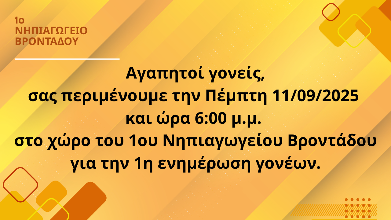 Η πρώτη ενημερωτική συνάντηση για γονείς,θα πραγματοποιηθεί την Πέμπτη 11-09-2025 και ώρα 6:00 το απόγευμα στο νηπιαγωγείο μας ώστε να μας δοθεί η ευκαιρία ,να γνωριστούμε,να συζητήσουμε διάφορα θέματα που αφορούν στη λειτουργία του νηπιαγωγείου και στη συνεργασίας μας για τη νέα σχολική χρονιά.