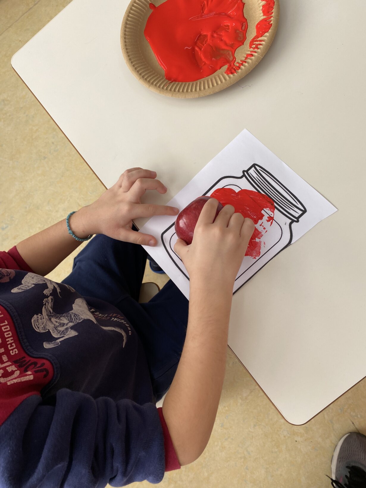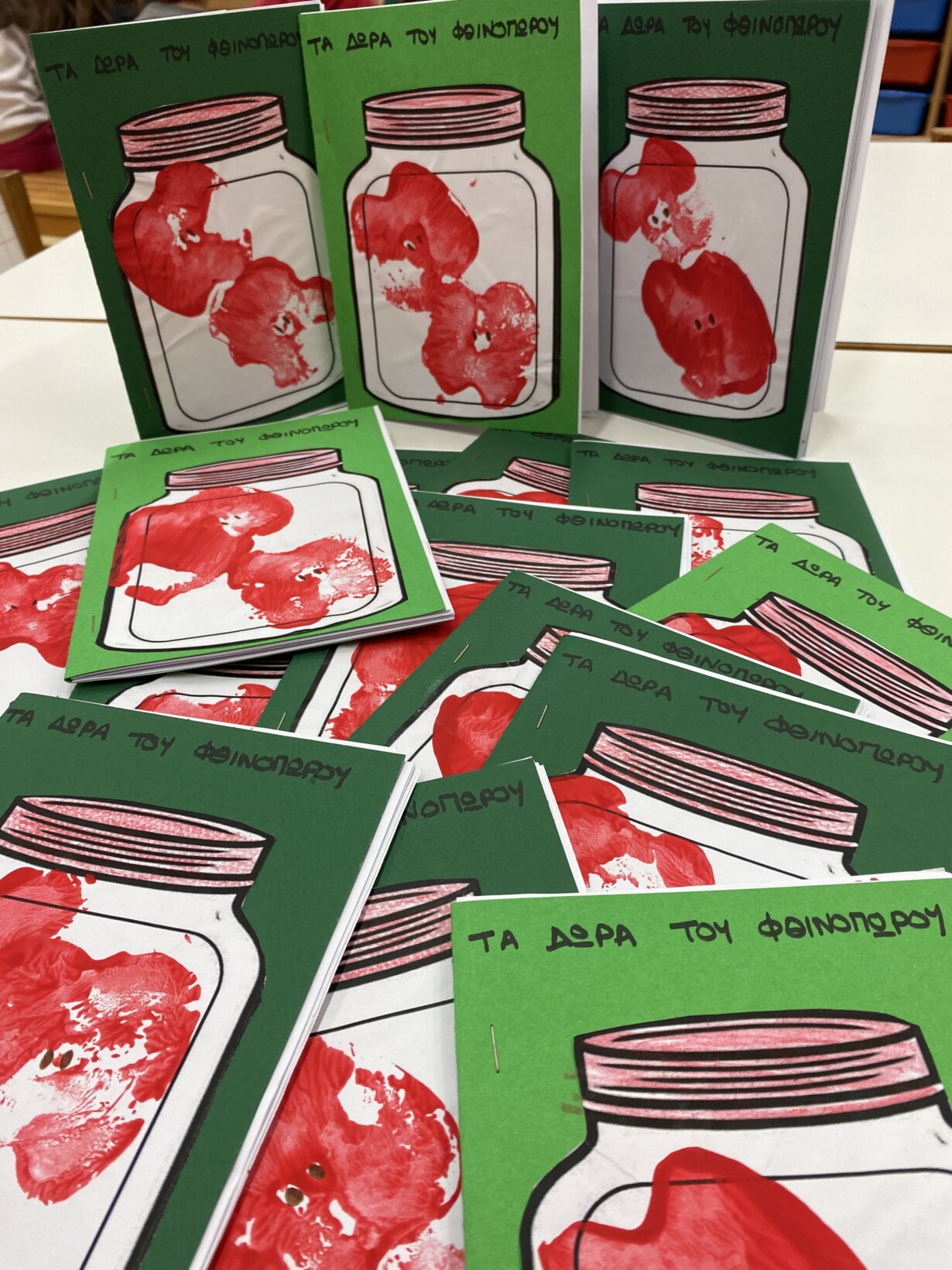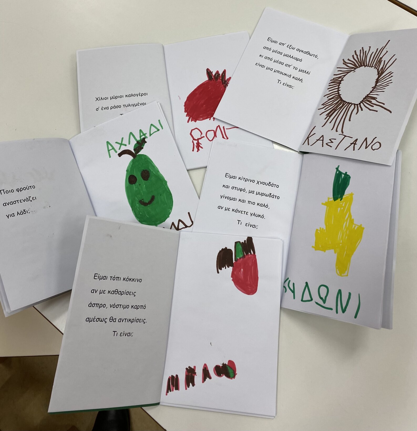 Μάθαμε αινίγματα για τα φθινοπωρινά φρούτα, κάναμε ένα βιβλίο με αυτά και διακοσμήσαμε το εξώφυλλό του με τυπώματα.