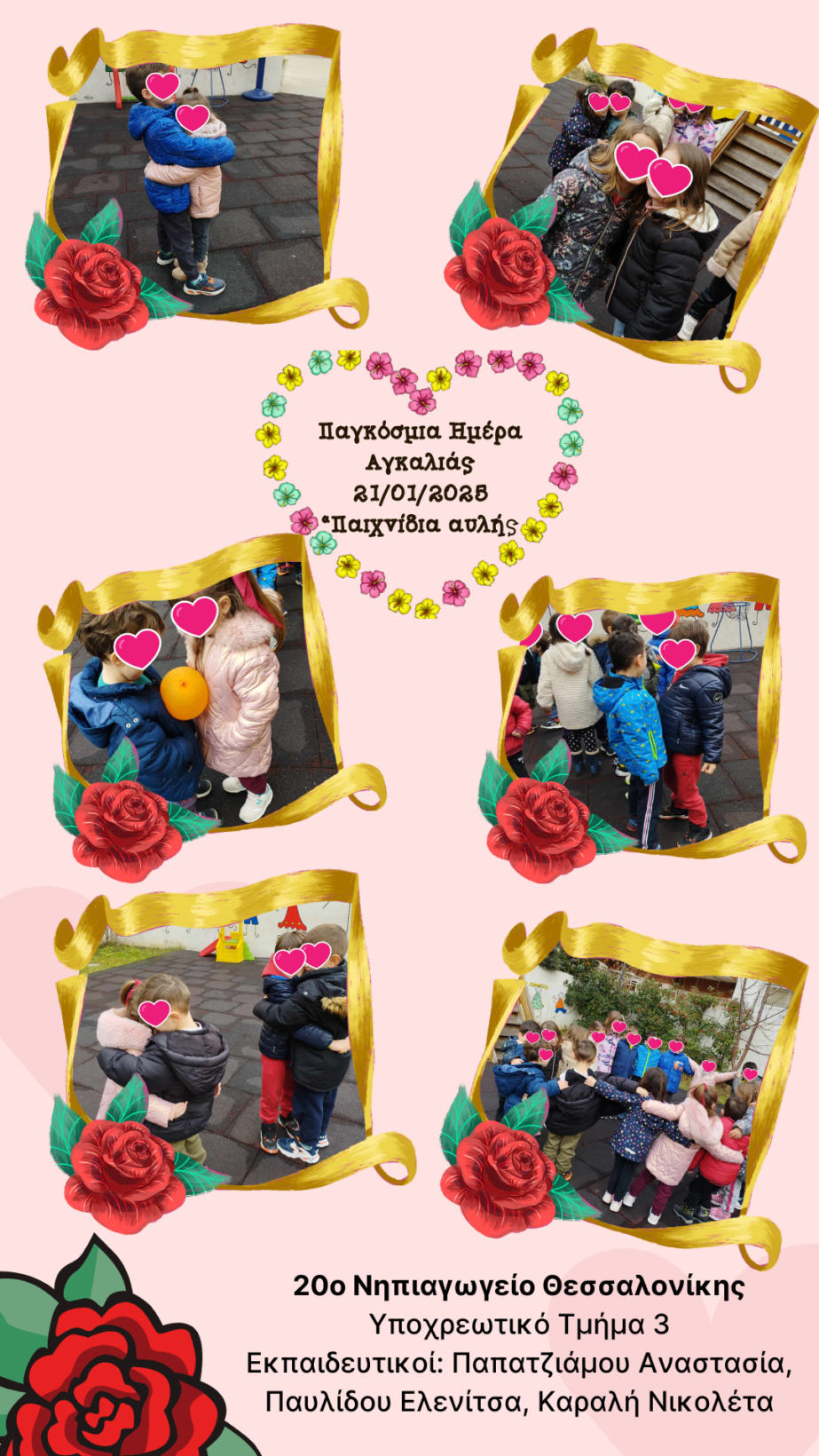 Με αφορμή την Παγκόσμια Ημέρα Αγκαλιάς 21.01.2025 , συμμετείχαμε στην πανελλήνια δράση του Δημοτικού Σχολείου Σοφικού Κορινθίας “Το κίνημα της αγκαλιάς”, με στόχο να χορτάσουμε αγκαλιές!