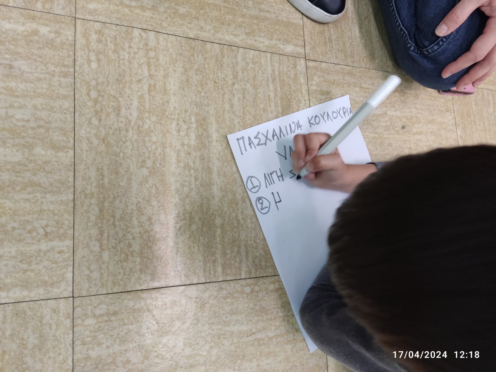 Χωριστήκαμε σε ομάδες και παρουσιασαμε σημεία από τα περάσματα που συζητήσαμε νωρίτερα! Τσουγκρίσματα αβγών, έντομα και πασχαλινά τραπέζια ήταν οι πρωταγωνιστές στις παρουσιάσεις των παιδιών!