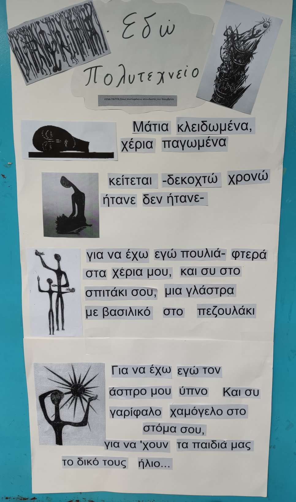 Ανήμερα την επέτειο του Πολυτεχνείου τραγουδήσαμε στους γονείς τα τραγούδια “Ο δρόμος” και το “Τα παιδιά ζωγραφίζουν στον τοίχο” φωνάζοντας στο τέλος “Ψωμί- Παιδεία- Ελευθερία”!