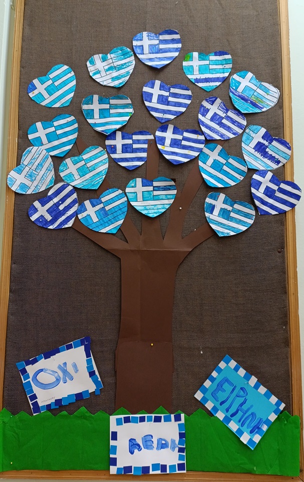 Γεμίσαμε το δέντρο στην αυλή μας με μηνύματα ενάντια στον πόλεμο! Τι σημαίνει να λέμε ΟΧΙ και τι ΝΑΙ. Νέες λέξεις που μάθαμε με αφορμή την επέτειο της 28ης Οκτωβρίου 1940. “Ειρήνη”, “Σημαία”, “Αέρα”.