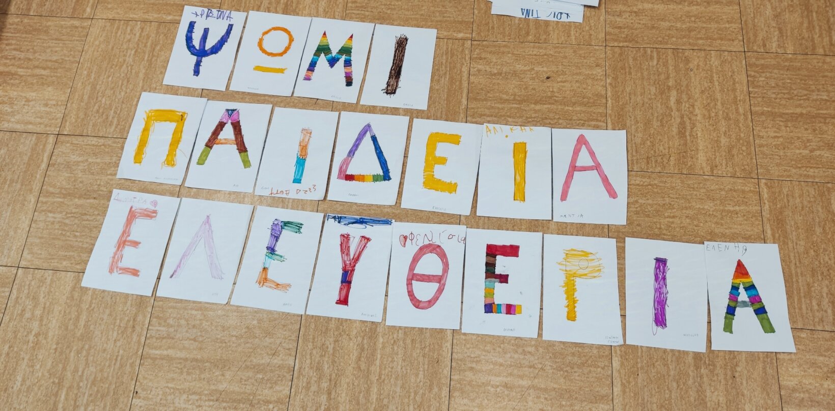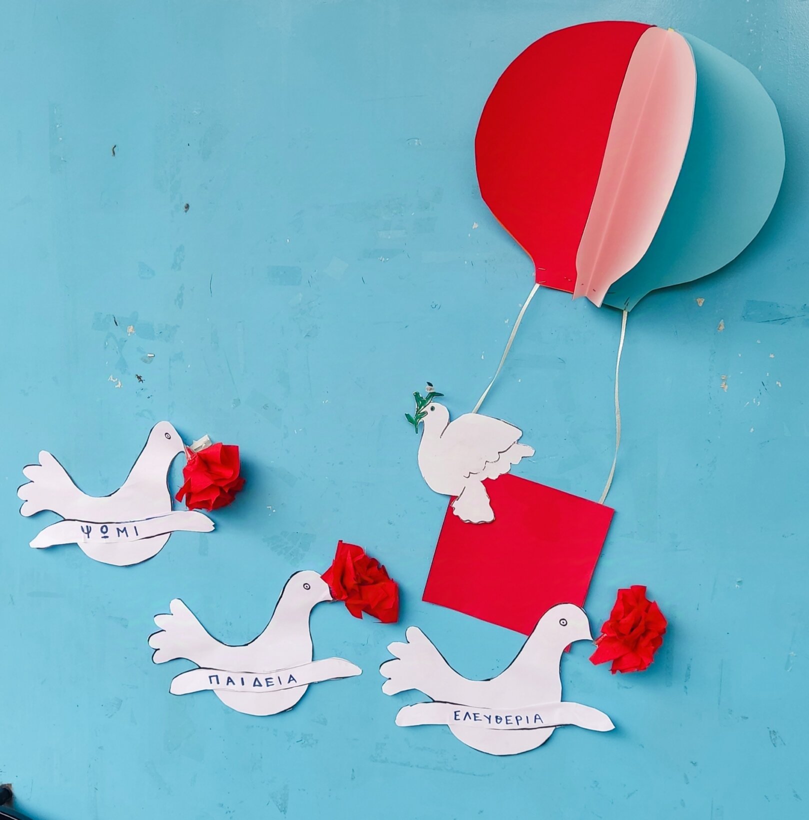 Ακούσαμε και τραγουδήσαμε τραγούδια για το Πολυτεχνείο, την Ελευθερία, τη Δημοκρατία και την Ειρήνη και μας δόθηκε ξανά η αφορμή να φτιάξουμε τα δικά μας περιστέρια της Ειρήνης, αυτή τη φορά με το σύνθημα “ΨΩΜΙ-ΠΑΙΔΕΙΑ-ΕΛΕΥΘΕΡΙΑ¨.