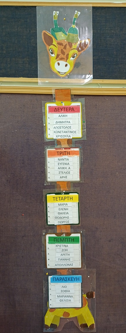 Καθημερινά, επίσης, υπάρχουν οι ομάδες των βοηθών/υπεύθυνων της τάξης που αναλαμβάνουν καθήκοντα και βοηθούν στις καθημερινές δραστηριότητες της τάξης. Αυτό βοηθάει τα παιδιά να νιώσουν υπεύθυνα και ξεχωριστά.