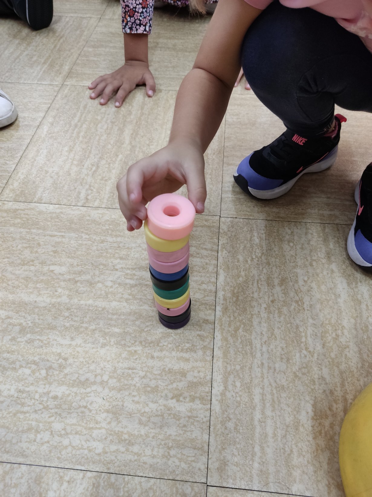 Φτιάχνουμε ένα πύργο με χρωματιστές χάντρες.Ένα ,ένα παιδί βάζει από μια χάντρα ,ονοματίζει το χρώμα και σε ποιά κατηγορία ανήκει (ψυχρό ή θερμό) και προσέχει μη πέσει ο πύργος.
