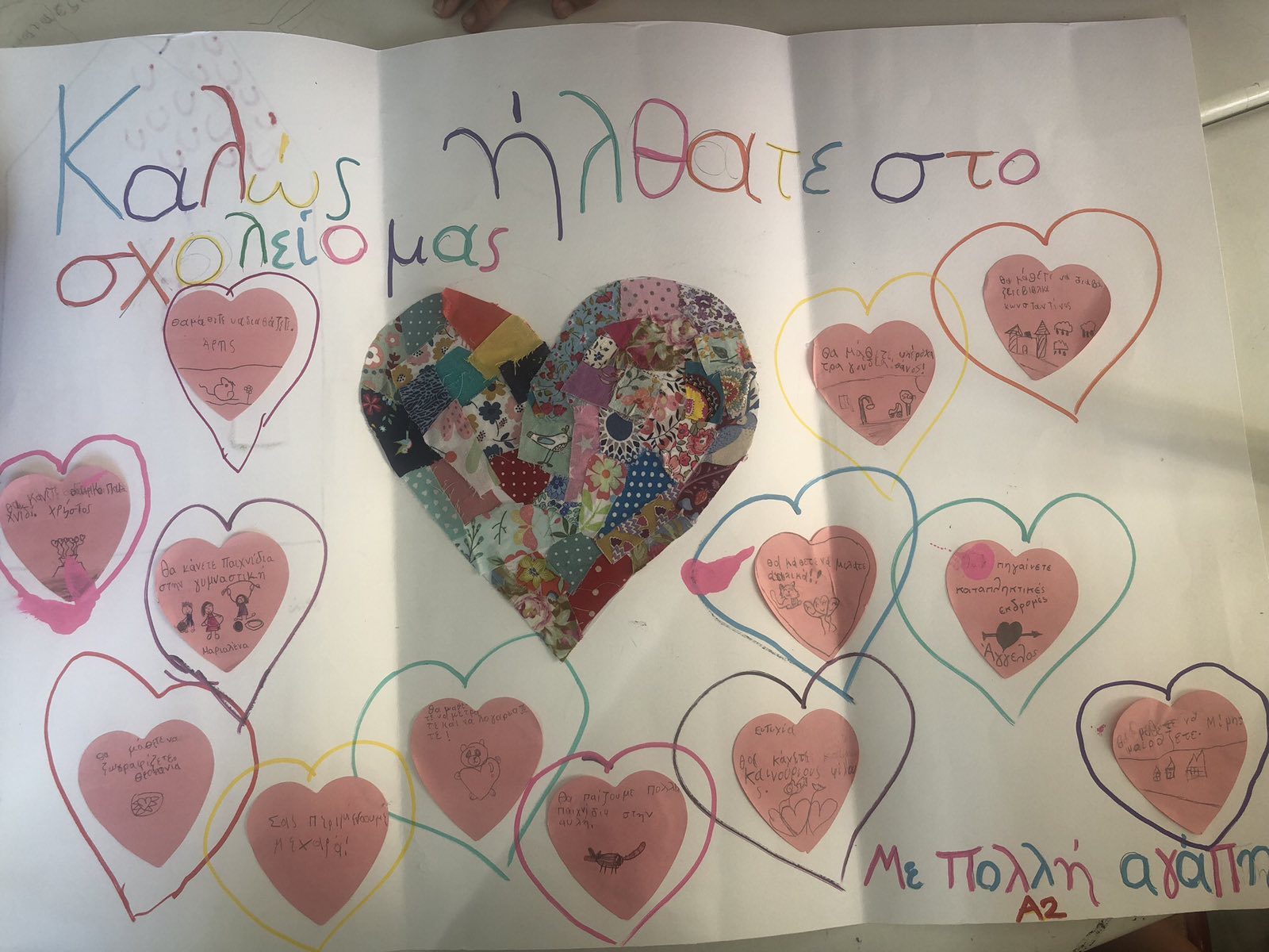 Η επίσκεψή τους ξεκίνησε στην Α’ τάξη, όπου τους υποδεχθήκαμε με πολλή χαρά. Οι μαθητές μας τους προσέφεραν μια μεγάλη κάρτα με ζωγραφιές και συμβουλές για το νέο τους ξεκίνημα, ενώ στη συνέχεια παρουσιάσαμε τα εποπτικά μέσα και τα σχολικά βιβλία που θα χρησιμοποιούν κατά τη διάρκεια των μαθημάτων.
