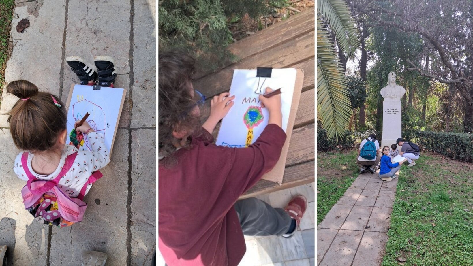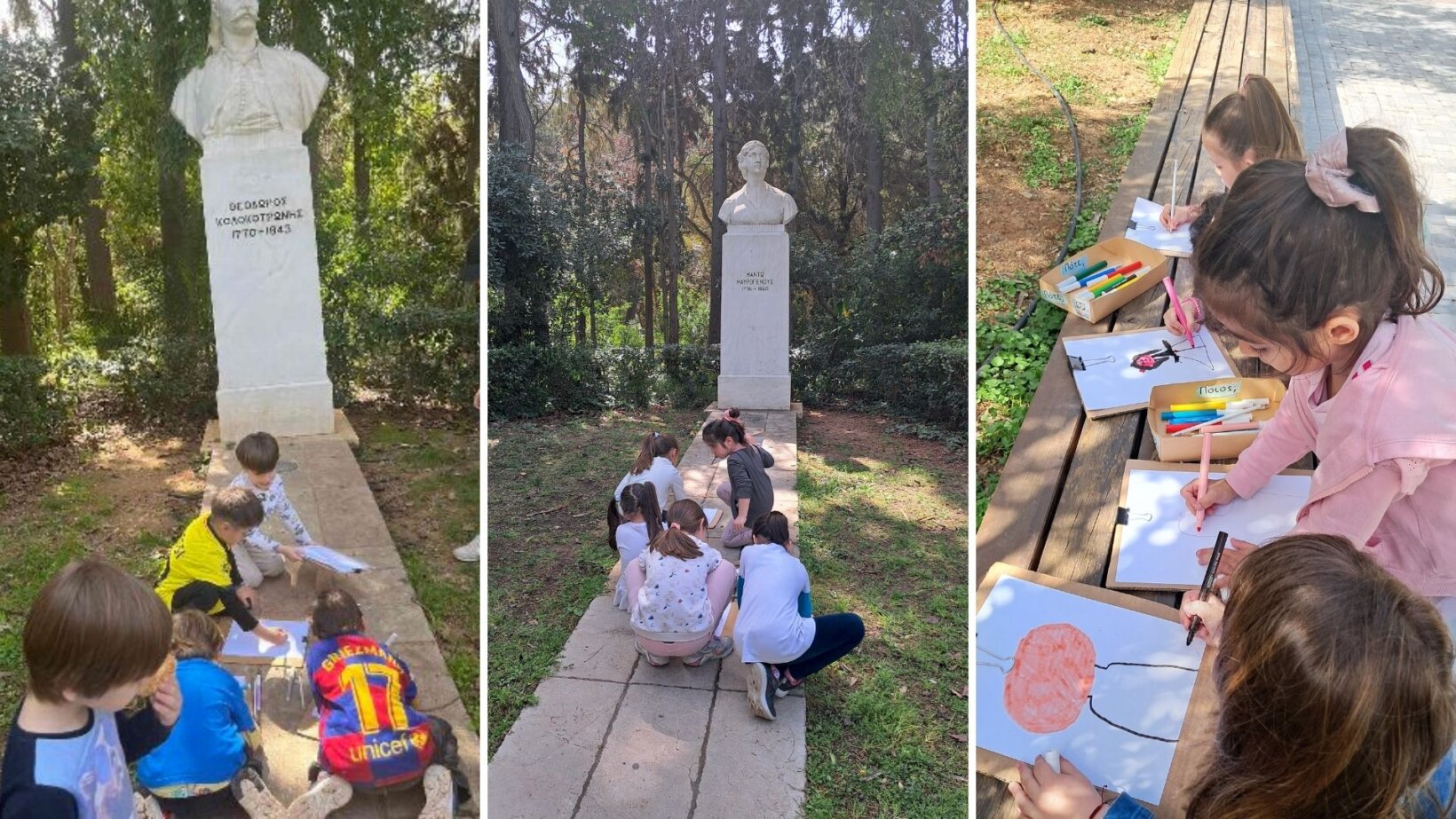 Απέναντι από τις προτομές στήσαμε το εικαστικό ατελιέ. Τα παιδιά επιλέξανε τον ήρωα ή ηρωίδα που θέλανε να αποτυπώσουν και με τους μαρκαδόρους τους ζωγράφισαν προτομές.