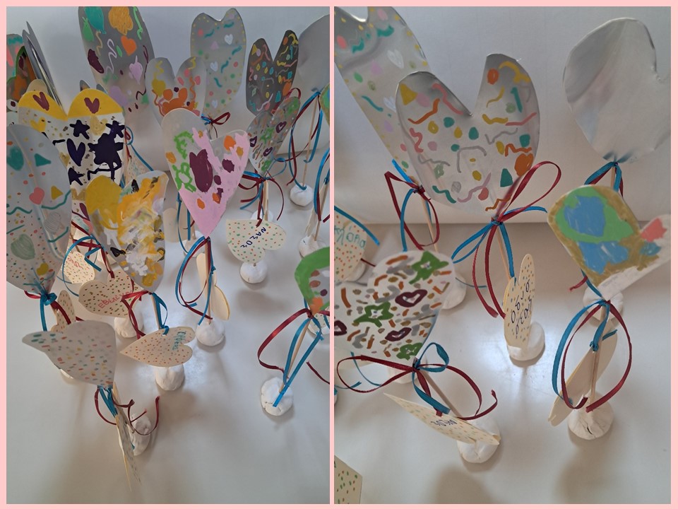 Τα παιδιά σκιτσάρανε σε απλό χαρτί μια καρδιά την οποία μεταφέραμε σε αλουμινόφυλλο και την κόψαμε. στη συνέχεια τις χρωμάτισαν με ανεξίτηλους μαρκαδόρους και έγραψαν ευχές. Τέλος κολλήσαμε τις καρδιές σε λεπτά ξυλάκια και τα τοποθετήσαμε σε μια βάση από πηλό.