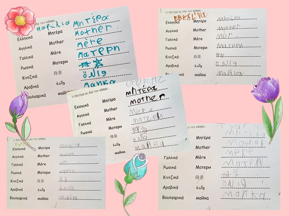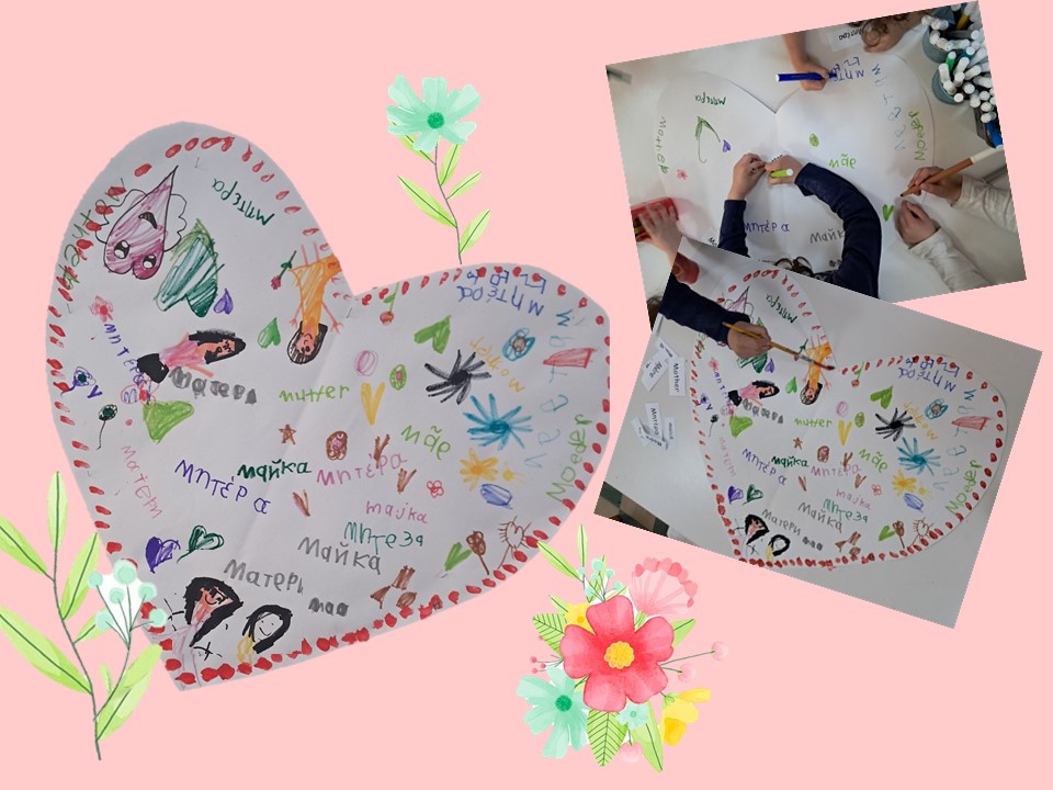 Σε μια μεγάλη καρδιά έγραψαν τη λέξη μητέρα σε διάφορες γλώσσες και παρατήρησαν πως στο άκουσμα μοιάζει η λέξη μητέρα σε πολλές γλώσσες και την διακόσμησαν με λουλούδια και καρδιές.
