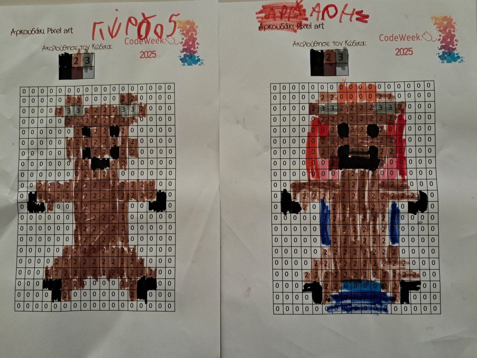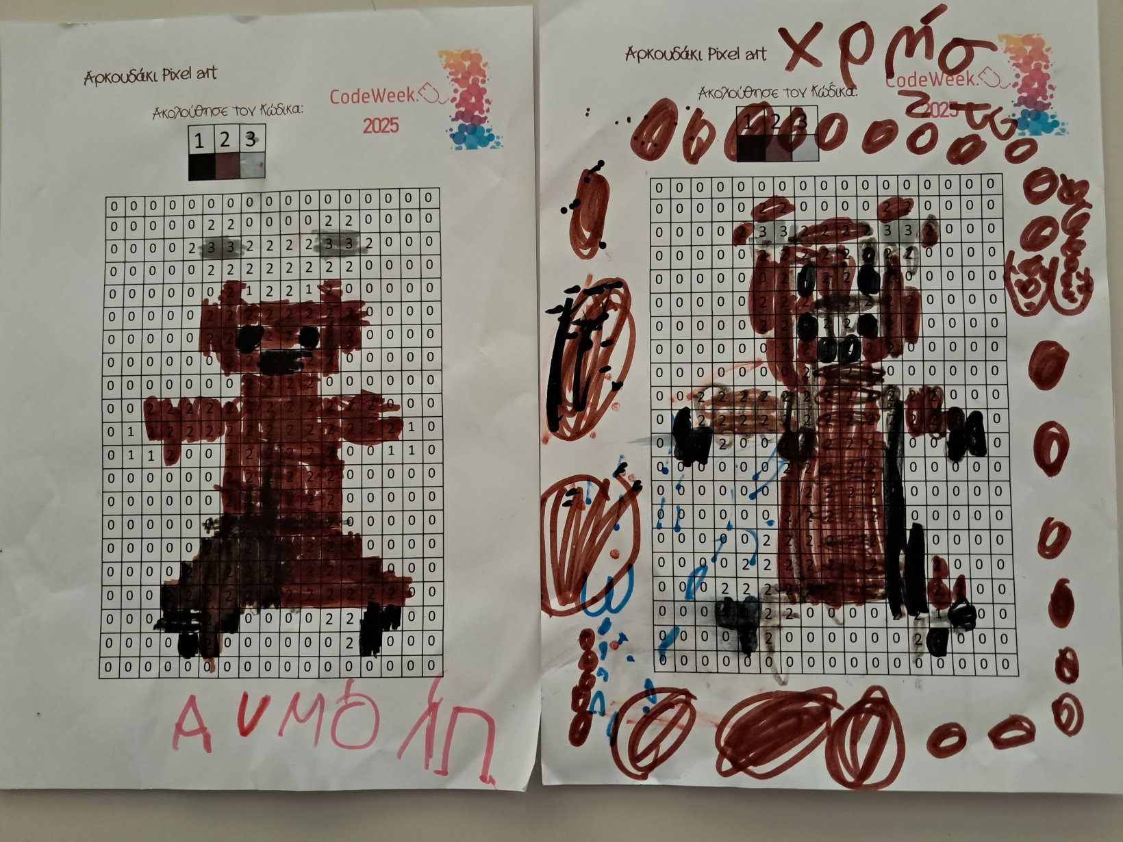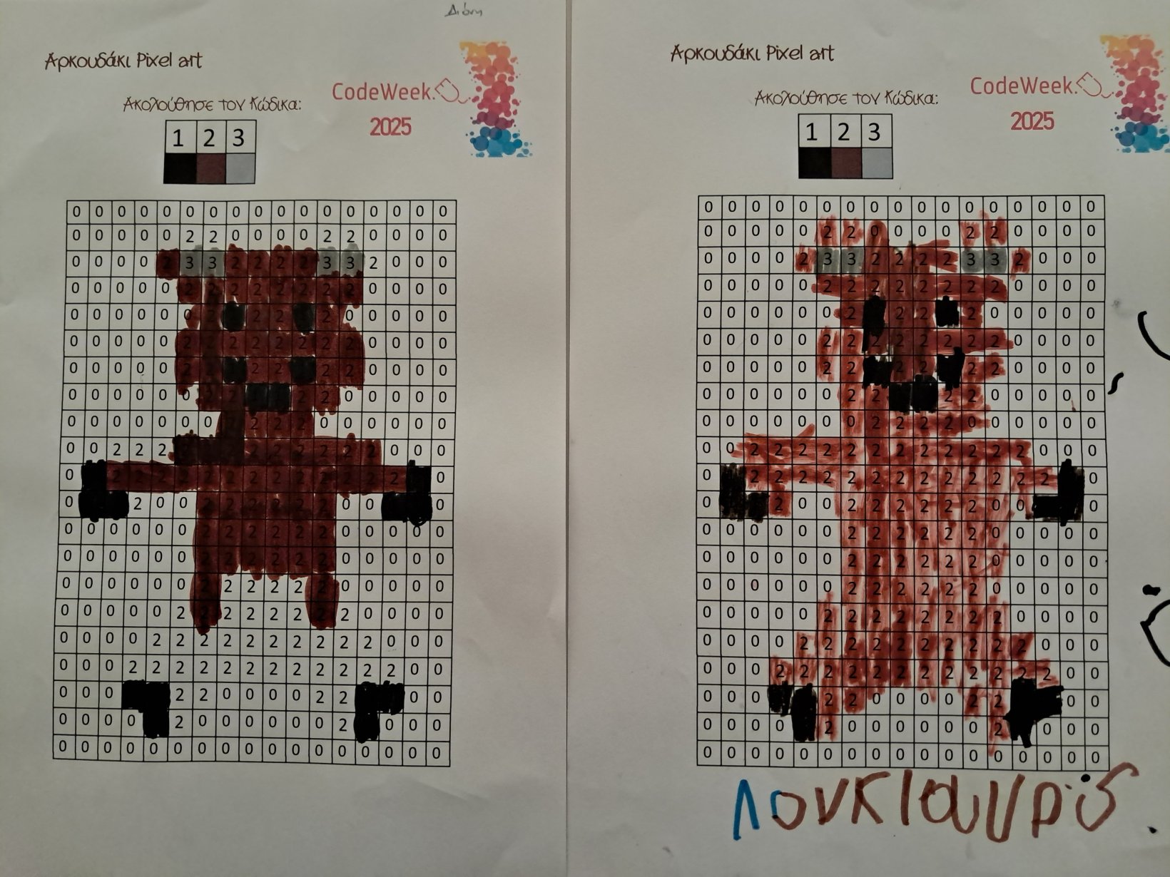 Ετοιμάσαμε ένα φύλλο εργασίας pixel art με θέμα τον Ούσκο. Μ΄ αυτή την δραστηριότητα οι μαθητές γνώρισαν τα pixels και δημιούργησαν μια εικόνα ακολουθώντας έναν κώδικα. Έτσι εισάγονται στην έννοια της ψηφιοποίησης εικόνων.