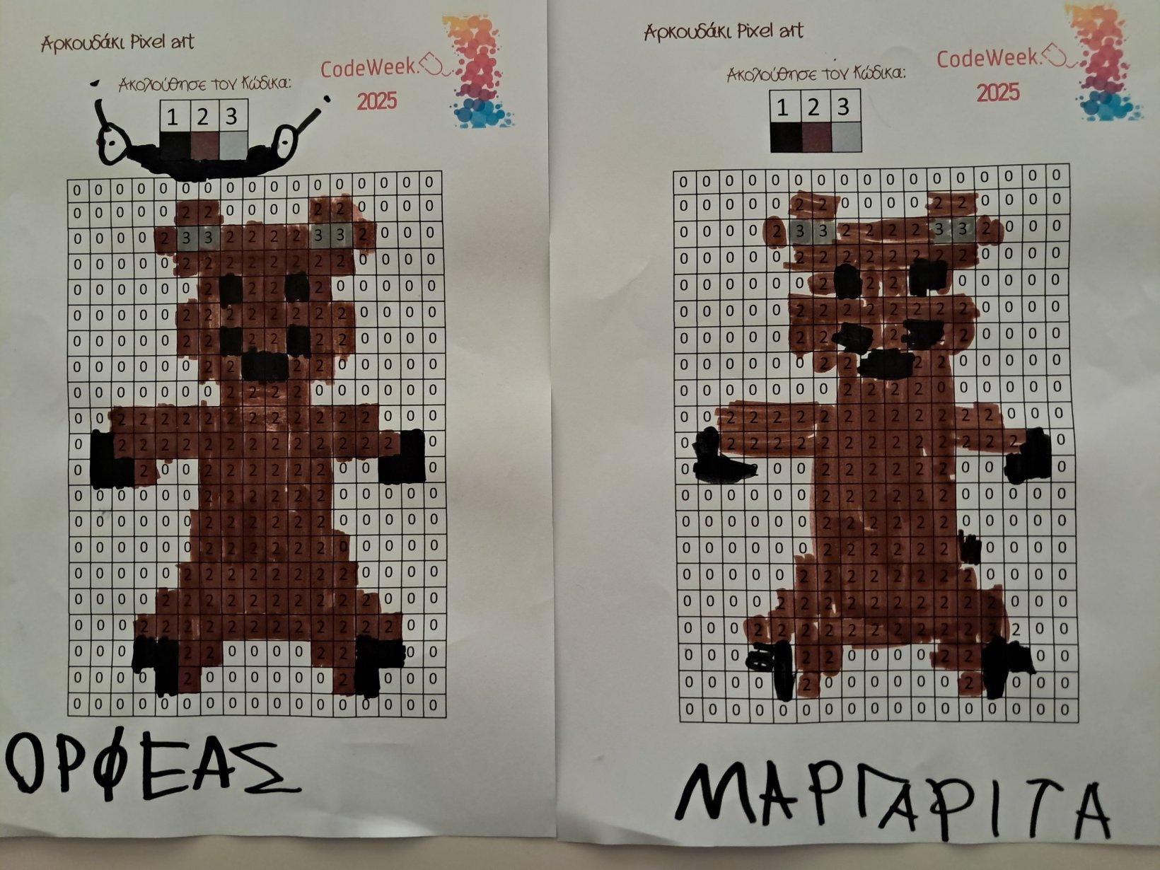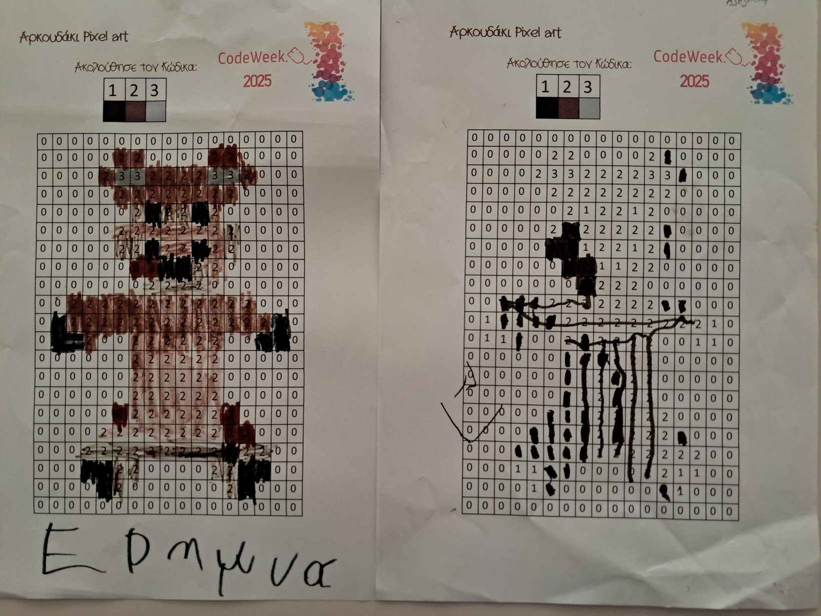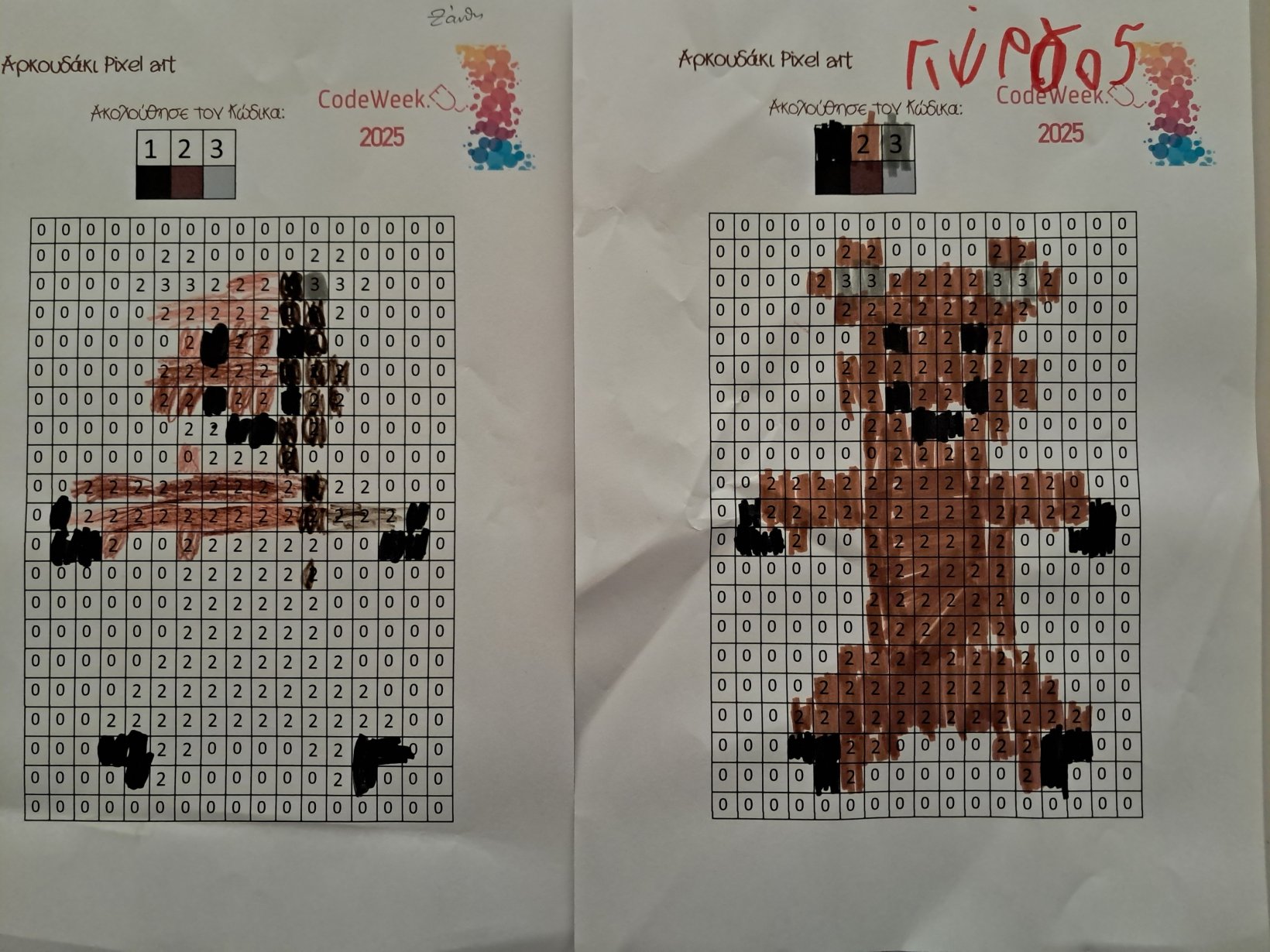 Ετοιμάσαμε ένα φύλλο εργασίας pixel art με θέμα τον Ούσκο. Μ΄ αυτή την δραστηριότητα οι μαθητές γνώρισαν τα pixels και δημιούργησαν μια εικόνα ακολουθώντας έναν κώδικα. Έτσι εισάγονται στην έννοια της ψηφιοποίησης εικόνων.