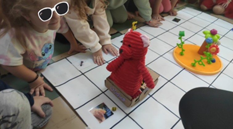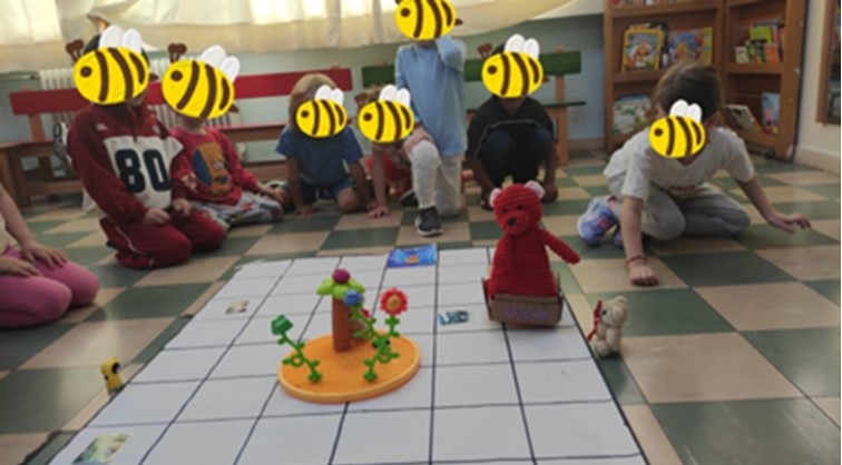 Τα εκτυπώσαμε και ύστερα τα απλώσαμε πάνω τετράγωνα του μουσαμά που χρησιμοποιούμε για τη ρομποτική. Τα παιδιά στόλισαν το μουσαμά με διάφορα παιχνίδια όπως δέντρα και λουλούδια και σε διάφορα σημεία έβαλαν κάποια αρκουδάκια απ’ το κουκλόσπιτο, ώστε ο Ούσκο να τα βρει, να κάνει καινούργιους φίλους και να μη νιώθει μοναξιά.
