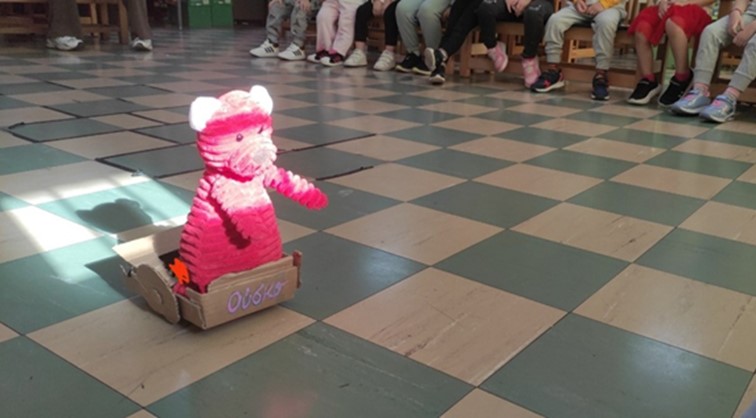 Το κάθε παιδί επέλεγε πού θέλει να πάει ή τι θέλει να φάει ο Ούσκο και, αντιστοίχως, πατούσε τα ανάλογα βελάκια προγραμματίζοντας τη Beebot, πάνω στην οποία προσαρμόσαμε ένα καροτσάκι φτιαγμένο από χαρτόκουτο.