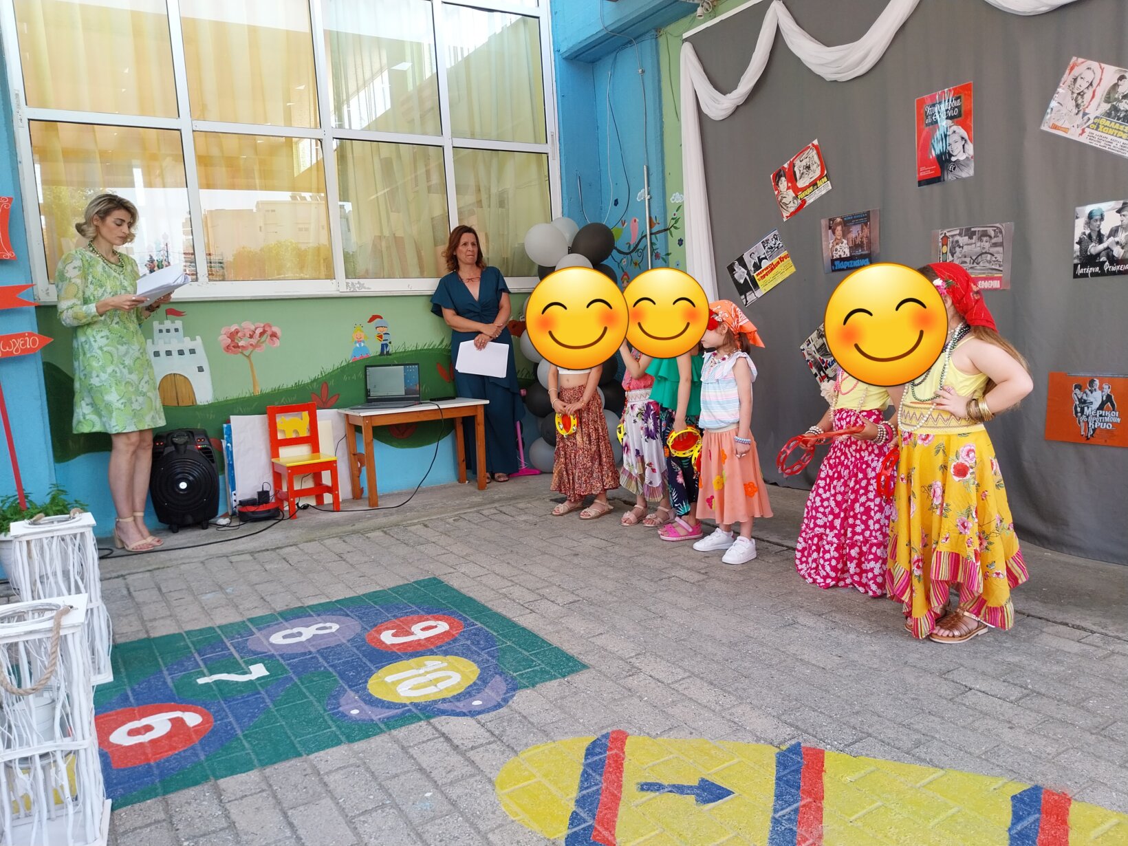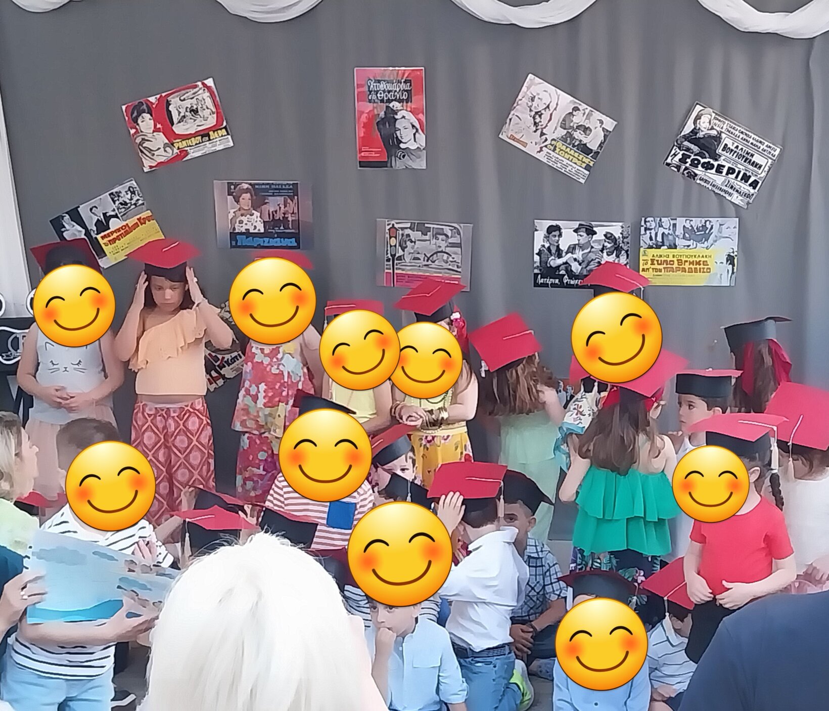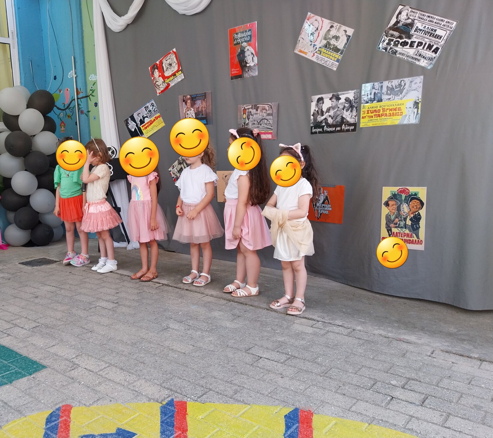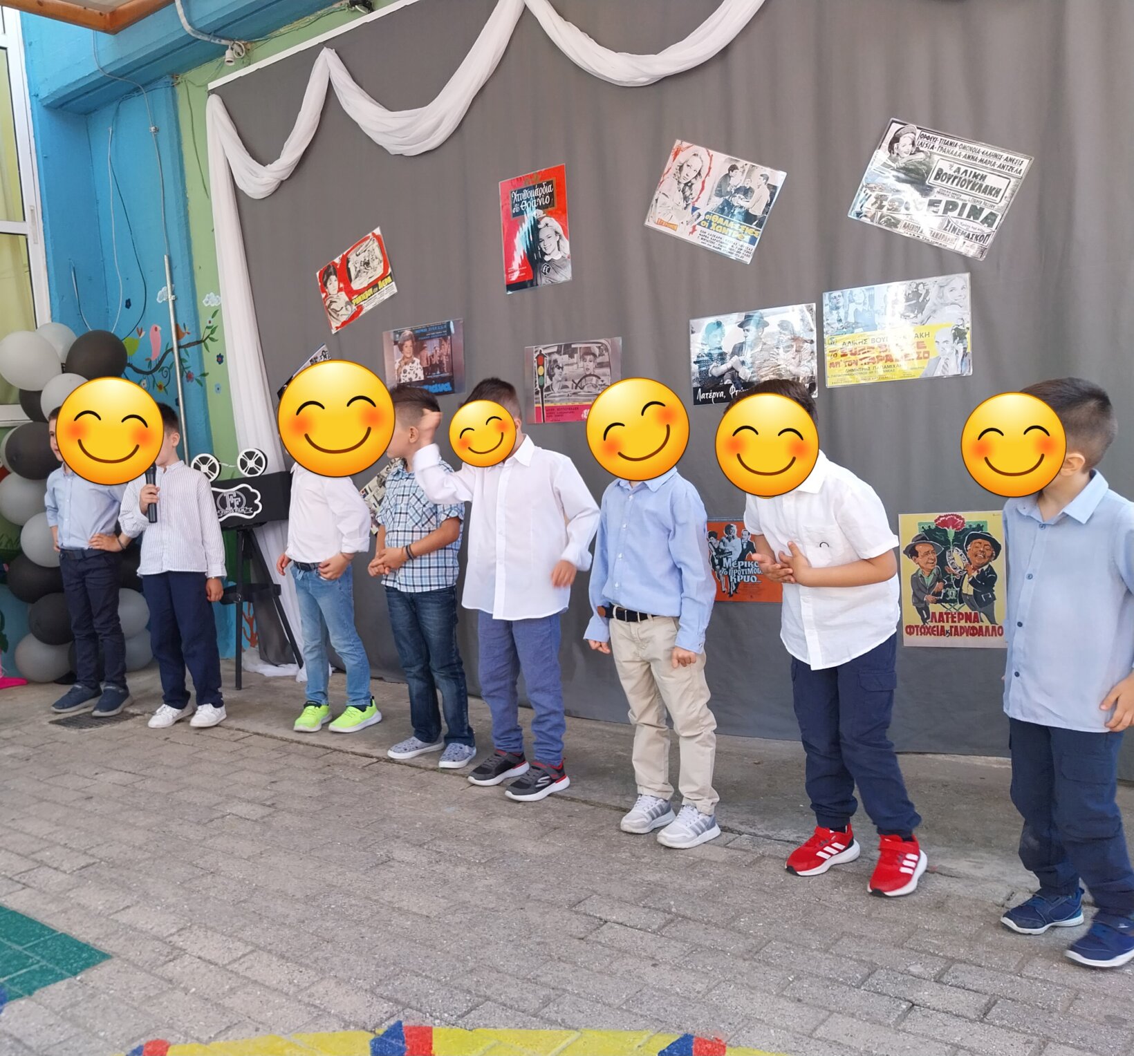 Έφτασε λοιπόν, η στιγμή που θα αποχαιρετήσουμε το νηπιαγωγείο με την καλοκαιρινή μας γιορτή ,που φέτος είχε θέμα τον ελληνικό κινηματογράφο. Τα παιδιά είχαν την ευκαιρία να μάθουν τους αστέρες της παλιάς εποχής, που σημείωναν μεγάλες επιτυχίες στα σινεμά την δεκαετία 1960-1970.Πληροφορήθηκαν για την Φίνος Φίλμ την εταιρεία παραγωγής ταινιών της εποχής μέσα από το διαδίκτυο, για τον τρόπο που γύριζαν τις ταινίες, τα σκηνικά και τα κουστούμια και συμμετείχαν στην δημιουργία του σκηνικού. Αποφασίσαμε σε όλες τις τάξεις, έπειτα από συζήτηση ,τον τίτλο της γιορτής Σαν παλιό σινεμά .. . και το ταξίδι πίσω στην εποχή του παλιού κινηματογράφου ξεκίνησε ….