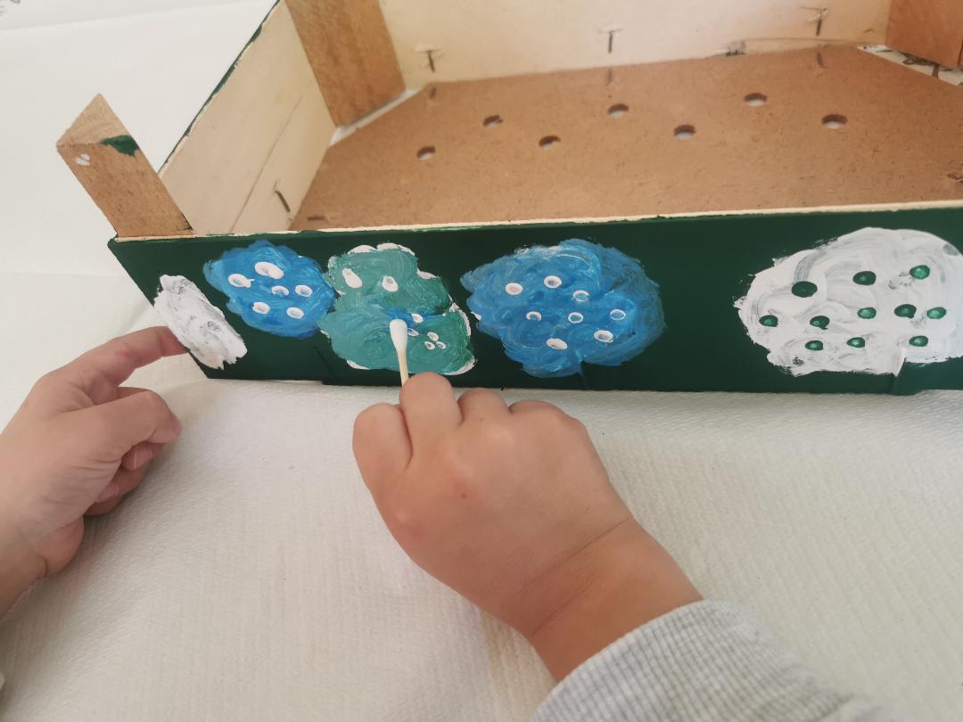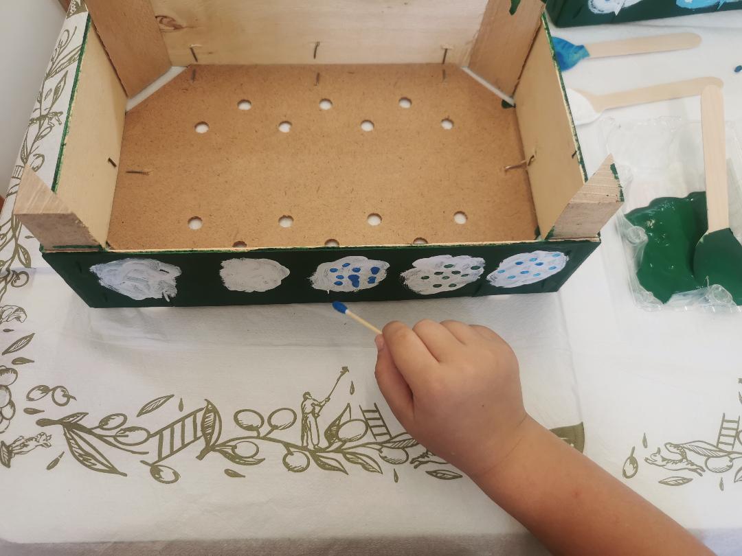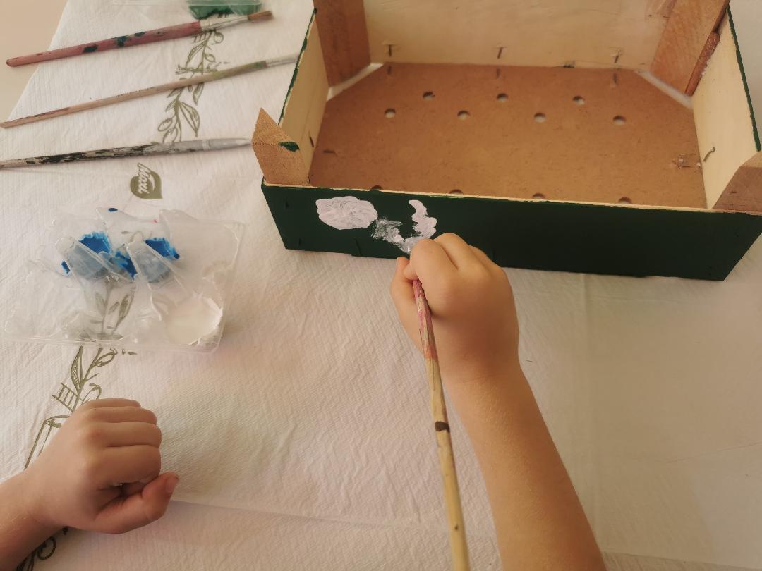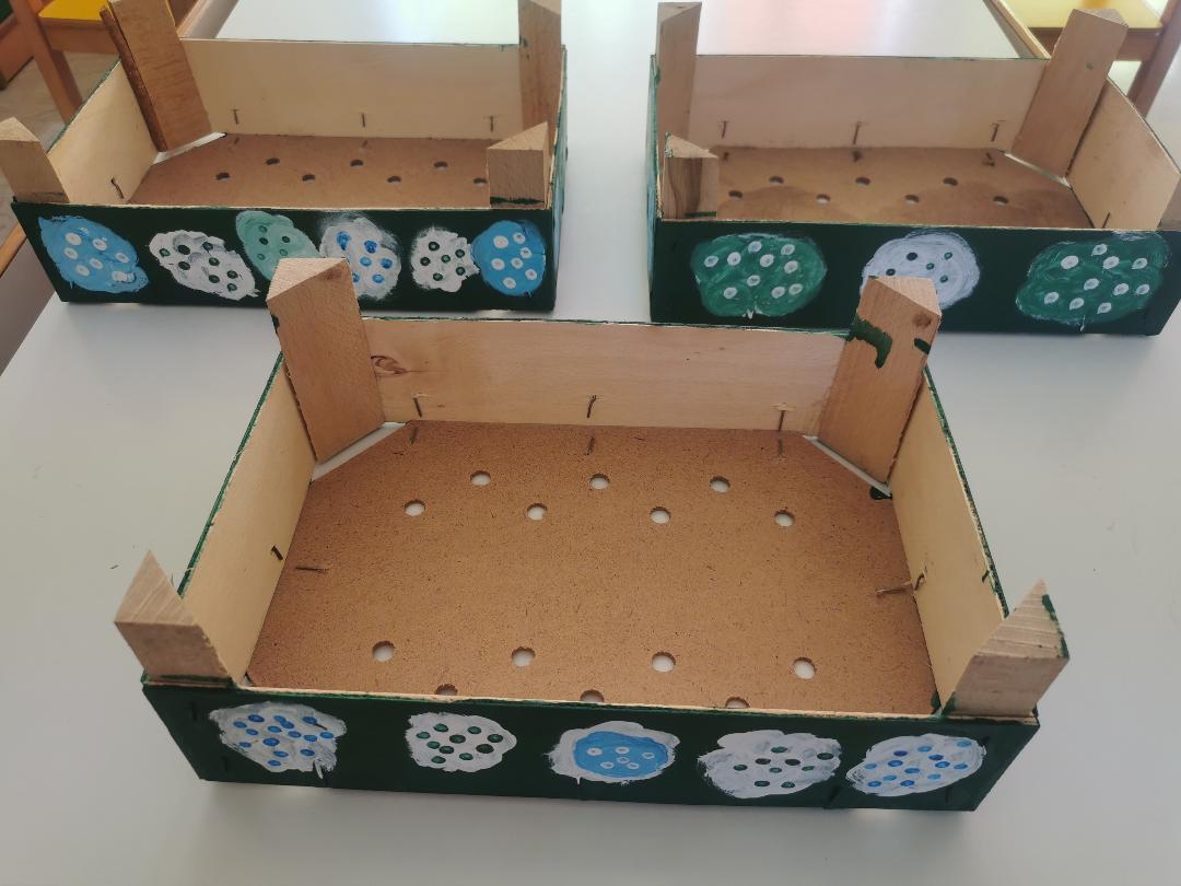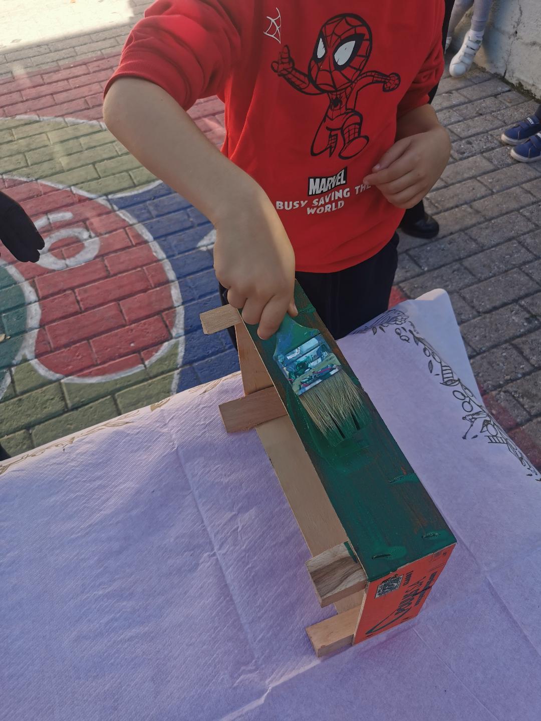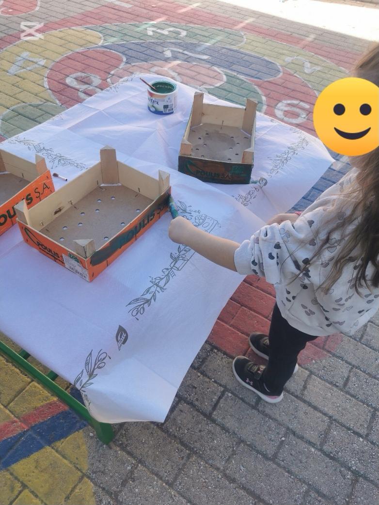 Μία από αυτές, ήταν να χρωματίσουμε με τα παιδιά μικρά ξύλινα καφάσια, τα οποία έφερε στο σχολείο μας, μια συμμαθήτριά τους. Αφού τα χρωμάτισαν με χρώματα που μας δάνεισαν τα παιδιά του άλλου τμήματος, αποφάσισαν να τα διακοσμήσουν σχεδιάζοντας μικρά λουλουδάκια. Μέσα σε αυτά στη συνέχεια του προγράμματός μας, θα φυτέψουμε διάφορα λουλούδια.