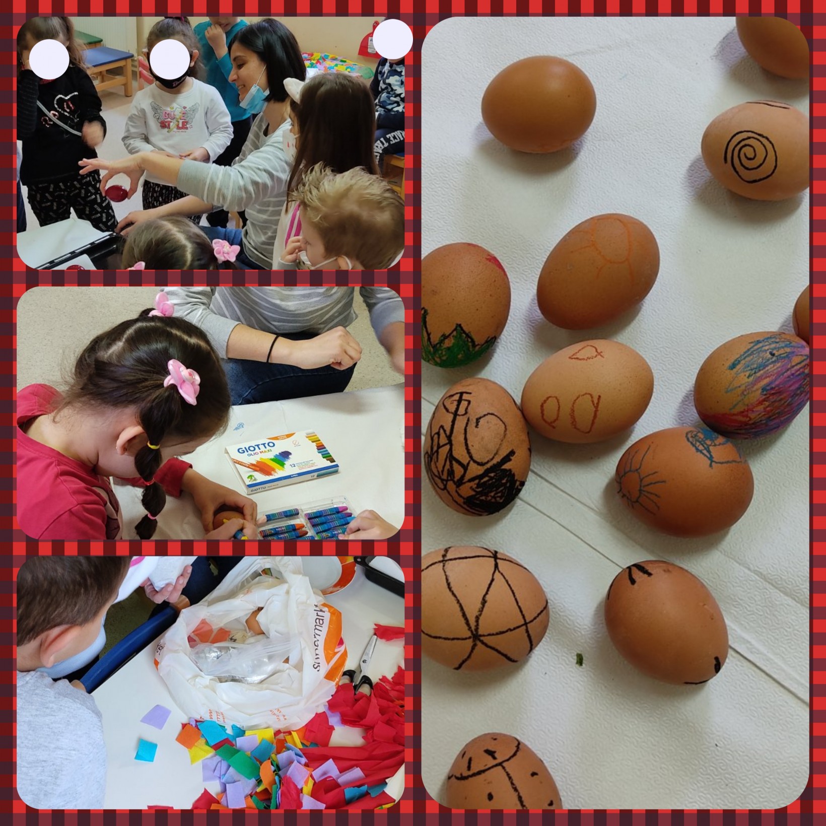 Ετοιμασίες για το Πάσχα Έφτασε η ώρα για κατασκευές και ετοιμασίες για το Πάσχα!!! Τα μισά αυγά μας είναι βαμμένα με κηρομπογιές και τα υπόλοιπα με γκοφρέ χαρτί.