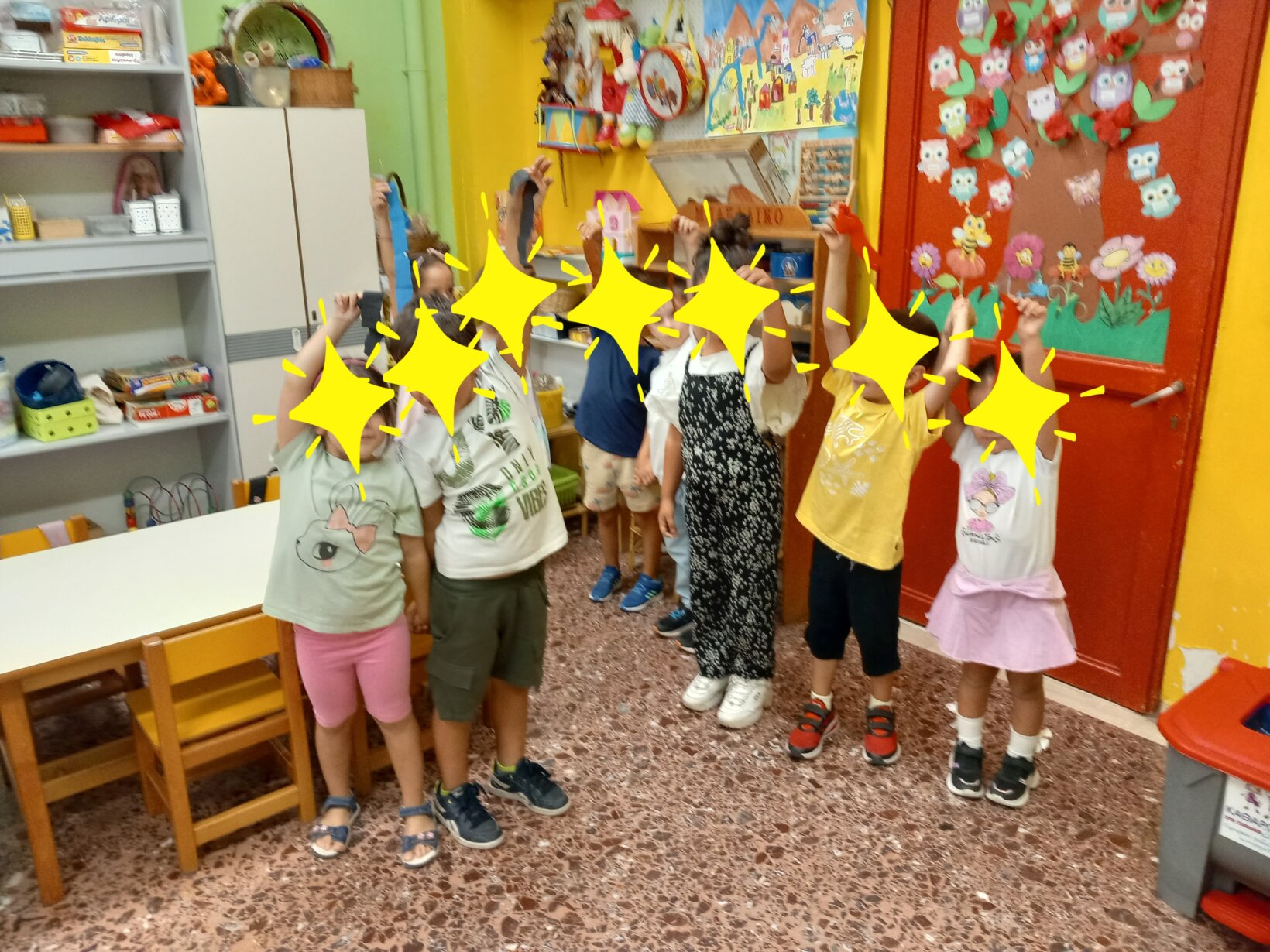 Κινητικό παιχνίδι: Η νηπιαγωγός χτυπάει ρυθμικά το ντέφι και τα παιδιά κινούνται ελεύθερα στο χώρο. Όταν σταματήσει το ντέφι πρέπει να κάνουν ζευγάρι με ένα συμμαθητή τους και να μπουν σε ένα στεφάνι. Όταν αρχίσει πάλι το ντέφι να χτυπάει κινούνται ελεύθερα στο χώρο. Όταν χτυπήσει γρήγορα πρέπει να μπουν όλα τα παιδιά σε ένα μεγάλο κύκλο και να φτιάξουν μια ομάδα.