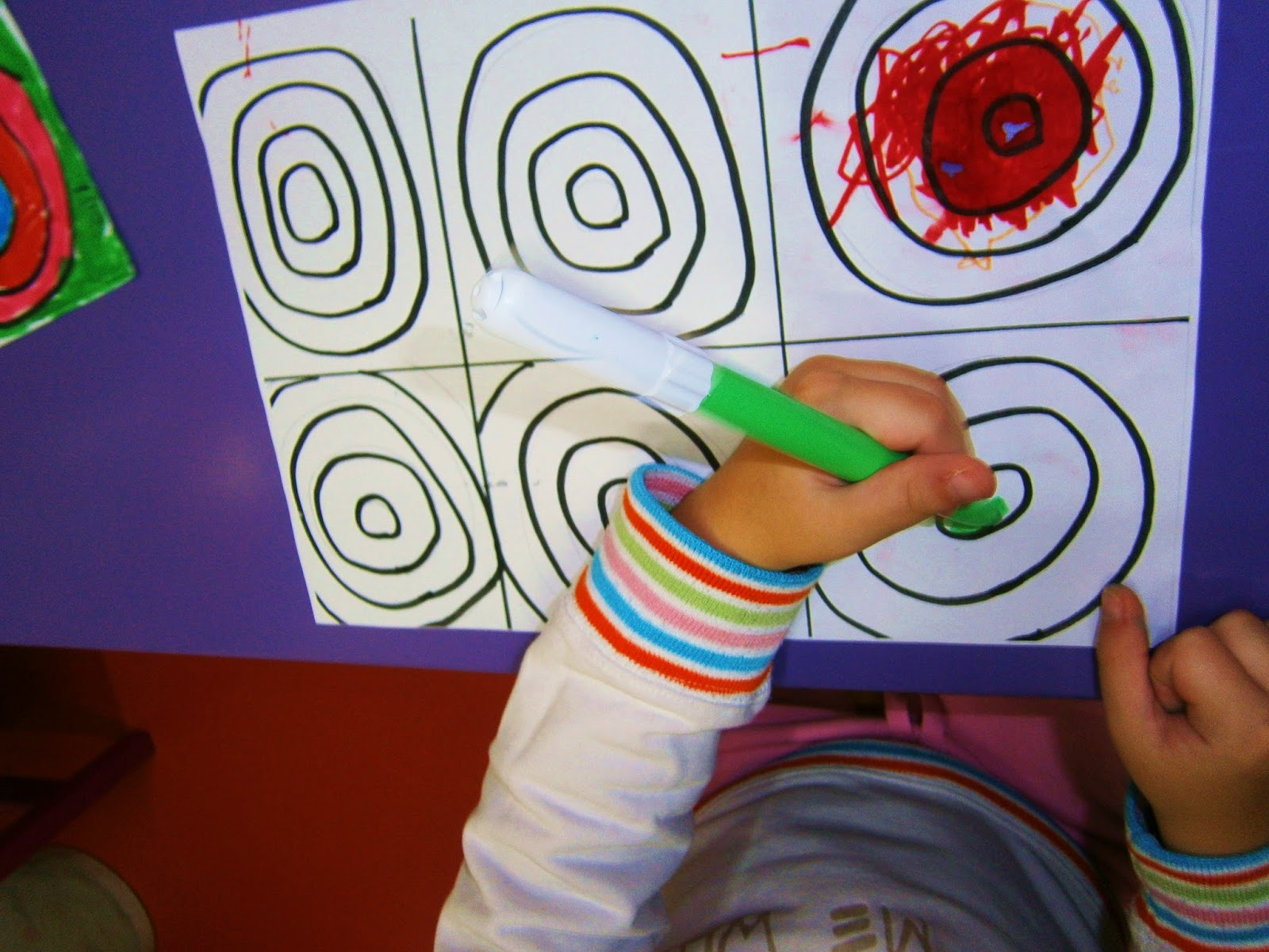 Γνωρίσαμε τον ζωγράφο Βασίλι Καντίνσκι μέσα από εικόνες και σταθήκαμε στο έργο του “Σπουδή χρωμάτων”. Με αφορμή αυτό το έργο μιλήσαμε για τα χρώματα, τη μουσική και τα συναισθήματα που εκφράζουμε μέσα από τα χρώματα. Στη συνέχεια, χωρίσαμε το χαρτί μας σε τετράγωνα και ζωγραφίσαμε ομόκεντρους χρωματιστούς κύκλους με λαδοπαστέλ. Τους κόψαμε και τους κολλήσαμε στα κλαδιά ενός δέντρου που χρωματίσαμε όλοι μαζί.
