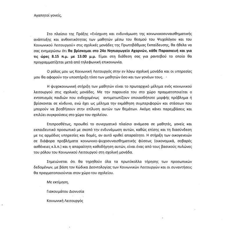 Ψυχολόγος -Κοινωνικός Λειτουργός / Psycologist – Social Worker 2024-2025 Επιστολή του κοινωνικού λειτουργού προς τους γονείς Λήψη αρχείου 2023-2024 Επιστολή της κοινωνικής λειτουργού προς τους γονείς