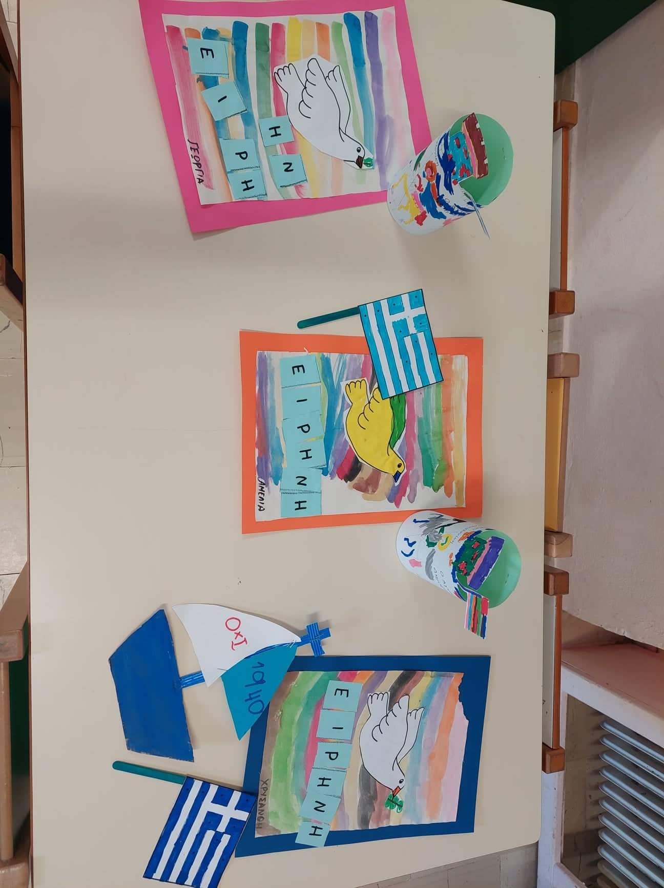 Τα παιδιά μας χρησιμοποίησαν διάφορες τεχνικές για να περιγράψουν τα συναισθήματα τους γύρω από τον πόλεμο και την ειρήνη, πώς τα φαντάζονται και πώς τα απεικονίζουν. Υποθέσαμε τους διαλόγους των στρατιωτών, δηλώσαμε ξεκάθαρα τη θέση μας υπέρ της ειρήνης, δουλεύοντας ατομικά και ομαδικά, φτιάχνοντας πανό.