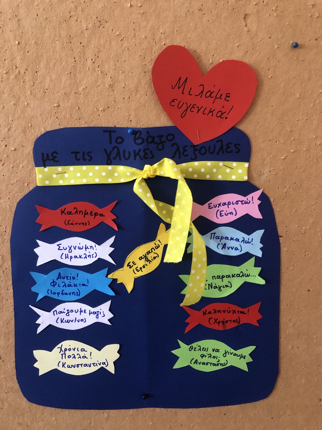 Στο σχολείο, μαθαίνουμε να είμαστε ευγενικοί και να μιλάμε με όμορφες λεξούλες! Γι’ αυτό φτιάχνουμε βάζα και τα γεμίζουμε με καραμέλες που περιέχουν….. γλυκές και ευγενικές λέξεις!