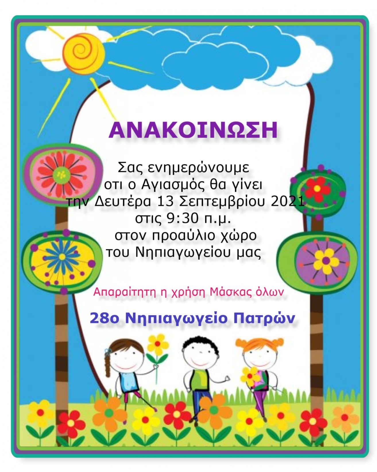 (Μετά τον Αγιασμό θα ακολουθήσει μια μικρή ενημέρωση από την Προϊσταμένη για την λειτουργία του Νηπιαγωγείου. Απαραίτητη η χρήση μάσκας όλων των μικρών μαθητών και των συνοδών )