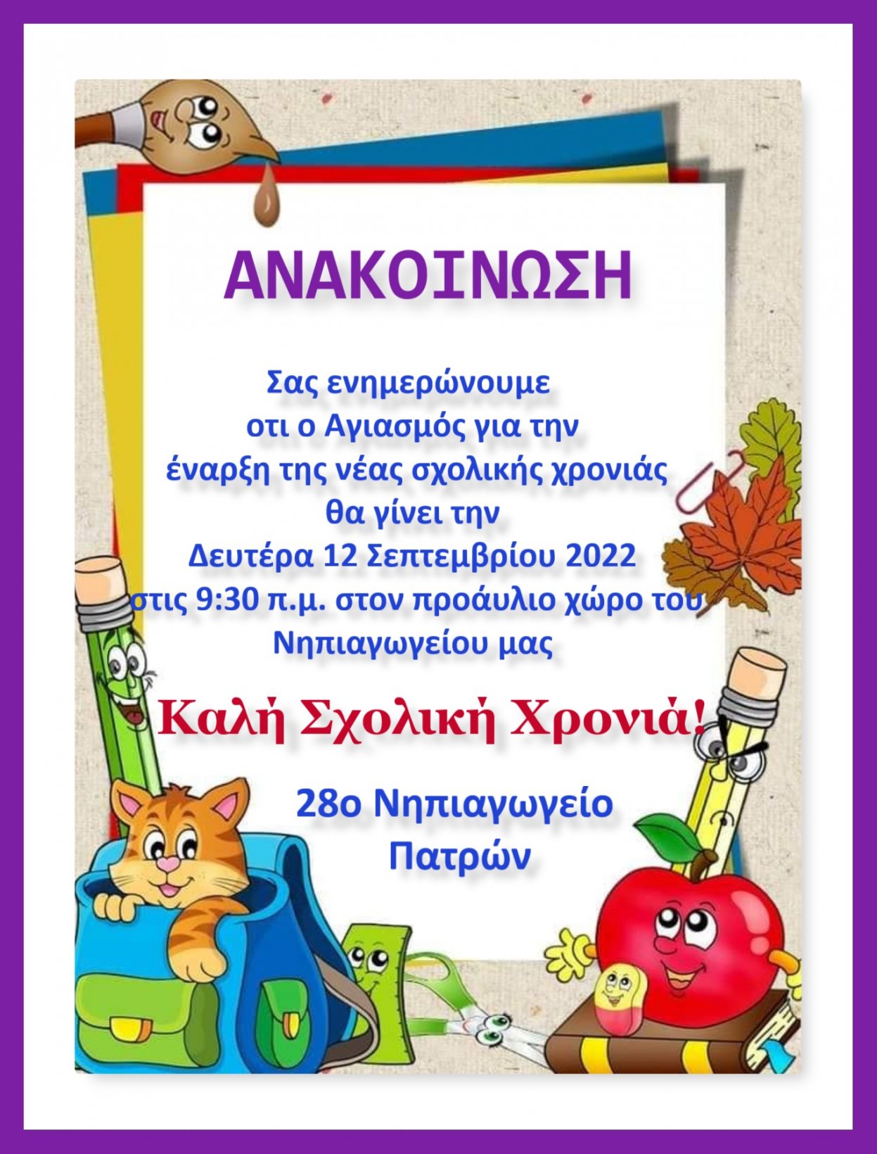 Συγγραφέας: 28ο ΝΗΠΙΑΓΩΓΕΙΟ ΠΑΤΡΑΣ | Κατηγορία Ανακοινώσεις | , στις 08-09-2022
