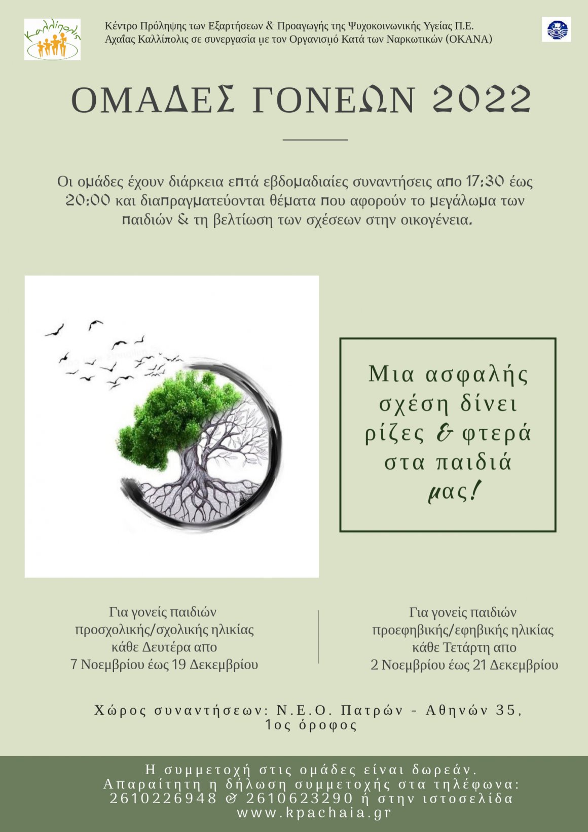 Το Κέντρο Πρόληψης των Εξαρτήσεων και Προαγωγής της Ψυχοκοινωνικής Υγείας Π.Ε. Αχαΐας Καλλίπολις πρόκειται να υλοποιήσει το αμέσως επόμενο χρονικό διάστημα ομάδες για γονείς παιδιών προσχολικής – σχολικής ηλικίας και για γονείς παιδιών προεφηβικής – εφηβικής ηλικίας, στην Πάτρα με δωρεάν συμμετοχή. Η ανάγκη στήριξης των γονέων είναι μια διαχρονική ανάγκη, καθώς όλοι αντιλαμβανόμαστε τις καθημερινές απαιτήσεις ενός ρόλου δίχως παύσεις και με διαρκείς αλλαγές και προσαρμογές καθώς τα παιδιά περνούν από το ένα στάδιο ανάπτυξης στο άλλο. Αυτός άλλωστε είναι ο λόγος που το Κέντρο Πρόληψης Αχαΐας από την έναρξη της λειτουργίας του έως σήμερα, σταθερά κάθε χρόνο επενδύει στη στήριξη των γονέων υλοποιώντας μια σειρά από ομάδες, ενημερωτικές συναντήσεις και εργαστήρια. Τα τελευταία δυο χρόνια οι συνέπειες της πανδημίας επηρέασαν τη συμπεριφορά και την ψυχοσύνθεση των παιδιών και κατά συνέπεια τους γονείς που καλούνται να σταθούν δίπλα στα παιδιά τους ως ένα σταθερό πλαίσιο ασφαλούς σχέσης. Εύλογα όμως αναδύονται ερωτήματα όπως: Τι γονείς είμαστε και τι έχουν ανάγκη σήμερα τα παιδιά από εμάς ως γονείς σε κάθε στάδιο της ανάπτυξης τους; Πώς μπορούμε να διαχειριστούμε καλύτερα τις δύσκολες συμπεριφορές των παιδιών και των εφήβων; Μέσα από ποιους πρακτικούς τρόπους θα βελτιώσουμε την καθημερινή επικοινωνία στην οικογένεια μας; Σε αυτά τα ερωτήματα αλλά και σε μια σειρά από άλλα που θέτουν οι γονείς, προσπαθούμε να απαντήσουμε μέσα στις ομάδες δουλεύοντας με βιωματικό τρόπο δηλαδή με συζήτηση σε μικρές ομάδες, μελέτη περιπτώσεων, αλληλεπίδραση με τους άλλους γονείς αλλά και με τους συντονιστές που είναι επαγγελματίες ψυχικής υγείας με πολυετή εμπειρία.