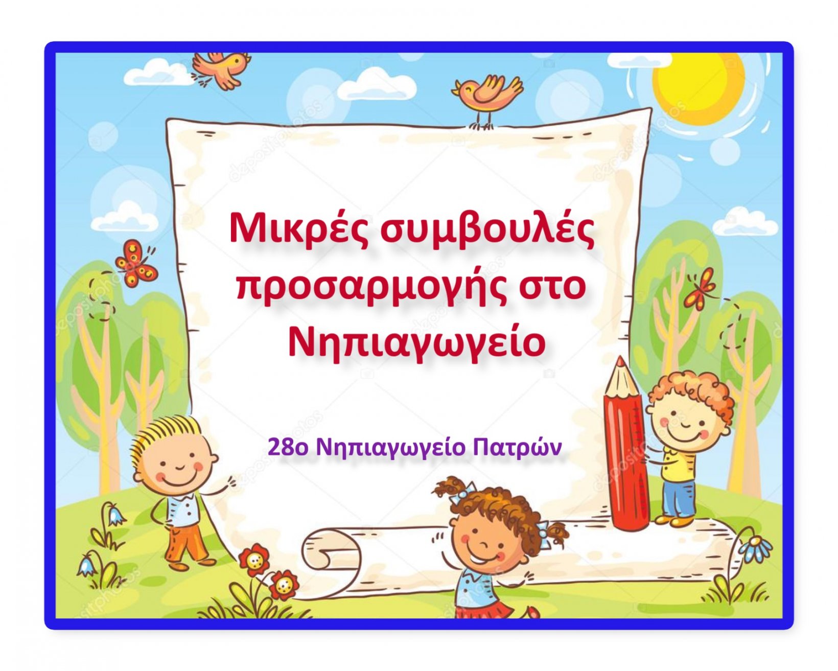 Σε μερικές μέρες  το Νηπιαγωγείο μας  θα ανοίξει και πάλι την πόρτα του  για να υποδεχτούμε με χαρά  τους μικρούς μαθητές μας! Η προσαρμογή των νηπίων και κυρίως των προνηπίων θέλει χρόνο (περίπου 2 εβδομάδες) και υπομονή. Τα συναισθήματα των παιδιών είναι ανάμεικτα και έντονα τον πρώτο καιρό.