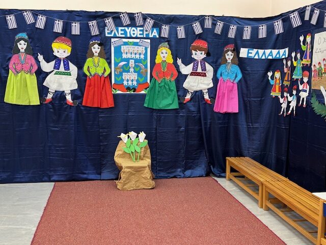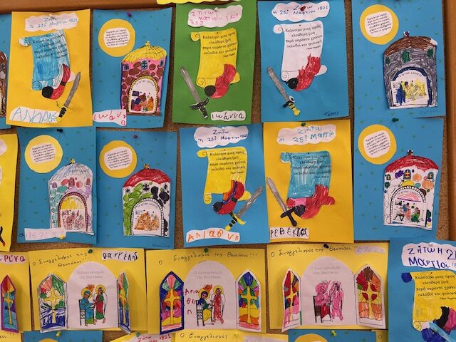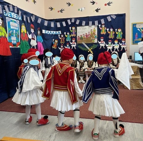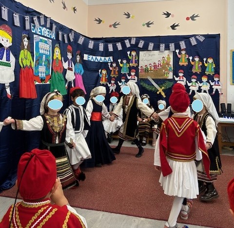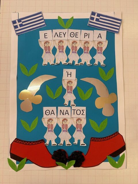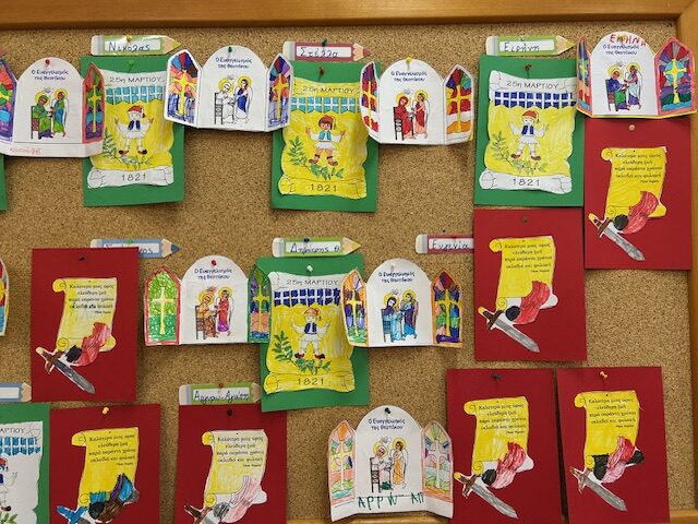 Μέσα από εικόνες ,πίνακες ζωγραφικής ,κείμενα ,ιστορίες ,ποιήματα και τραγούδια προσπαθήσαμε να προσεγγίσουμε δύσκολες έννοιες όπως… Ελευθερία, Ειρήνη, Σκλαβιά, Αυτοθυσία, Πόλεμος , Ηρωισμός, Αγάπη για την πατρίδα … Με το κατάλληλο εποπτικό υλικό για την ηλικία των μικρών μας μαθητών προσπαθήσαμε να μιλήσουμε τόσο για την μεγάλη γιορτή της Χριστιανοσύνης τον Ευαγγελισμό της Θεοτόκου, όσο και για την Επανάσταση του 1821…